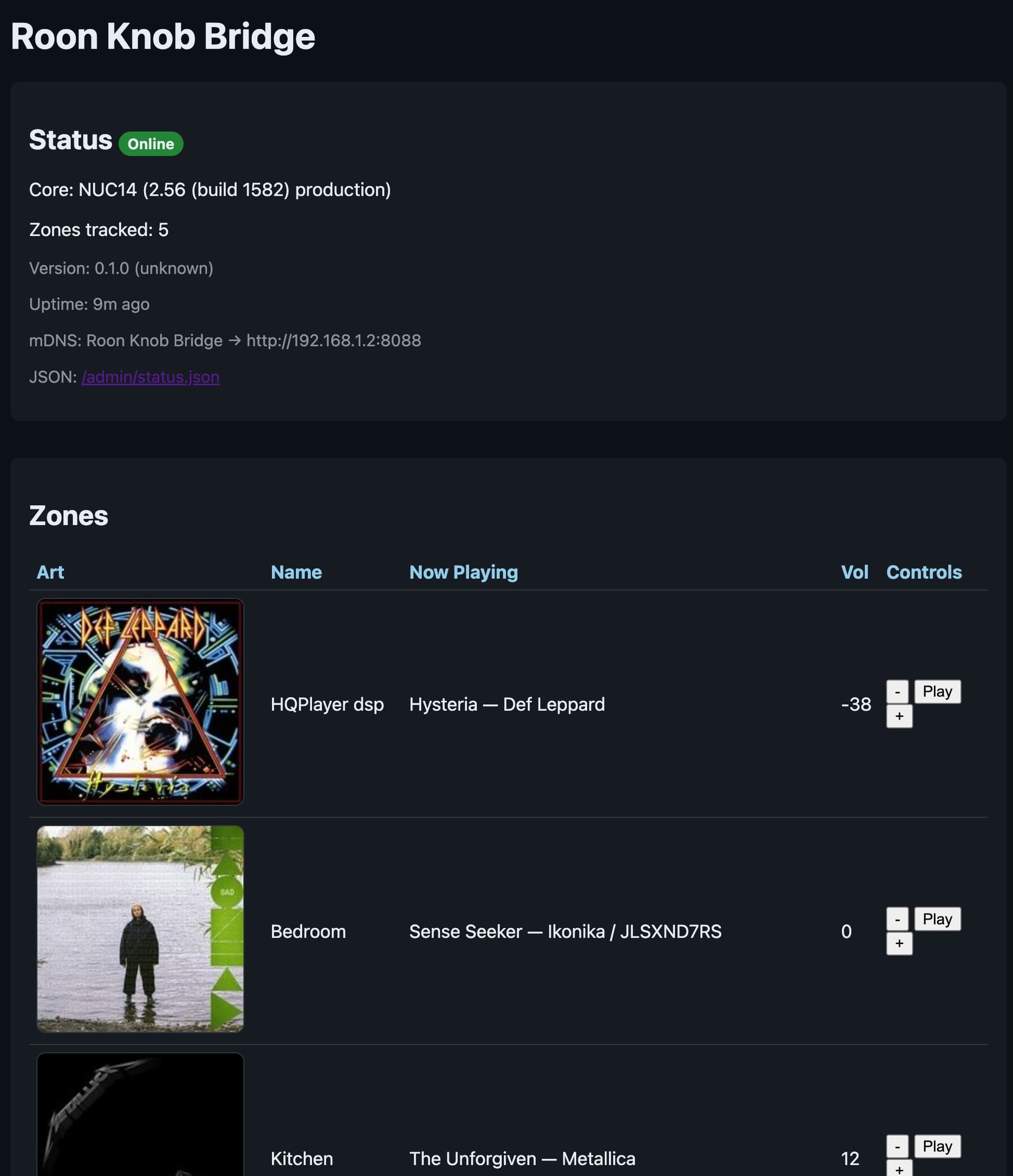 - Flash the firmware — Open the Flash Roon Knob Firmware in Chrome/Edge, plug in the knob via USB-C, click flash. Done in 30 seconds.