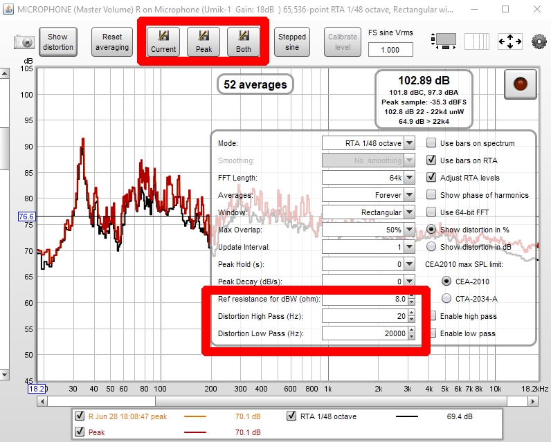 So, when saving the RTA data, do we want ācurrentā or āpeakā? And can the āRef Decayā, āRef resistanceā "Distortion high pass"and āDistortion low passā options be left as they are set by default?
