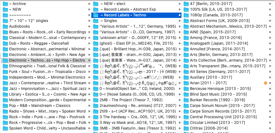 I’ve set up folder structures in similar groupings. Also new/recent/to tidy folders. Colour tags indicate in ‘physical collection’ or ‘personal encoding’. Groups I’d love to browse in Roon without massive setup hurdles. There’s 5,351 albums in the Independents folder, and I want to start sub-grouping to make it more digestable.