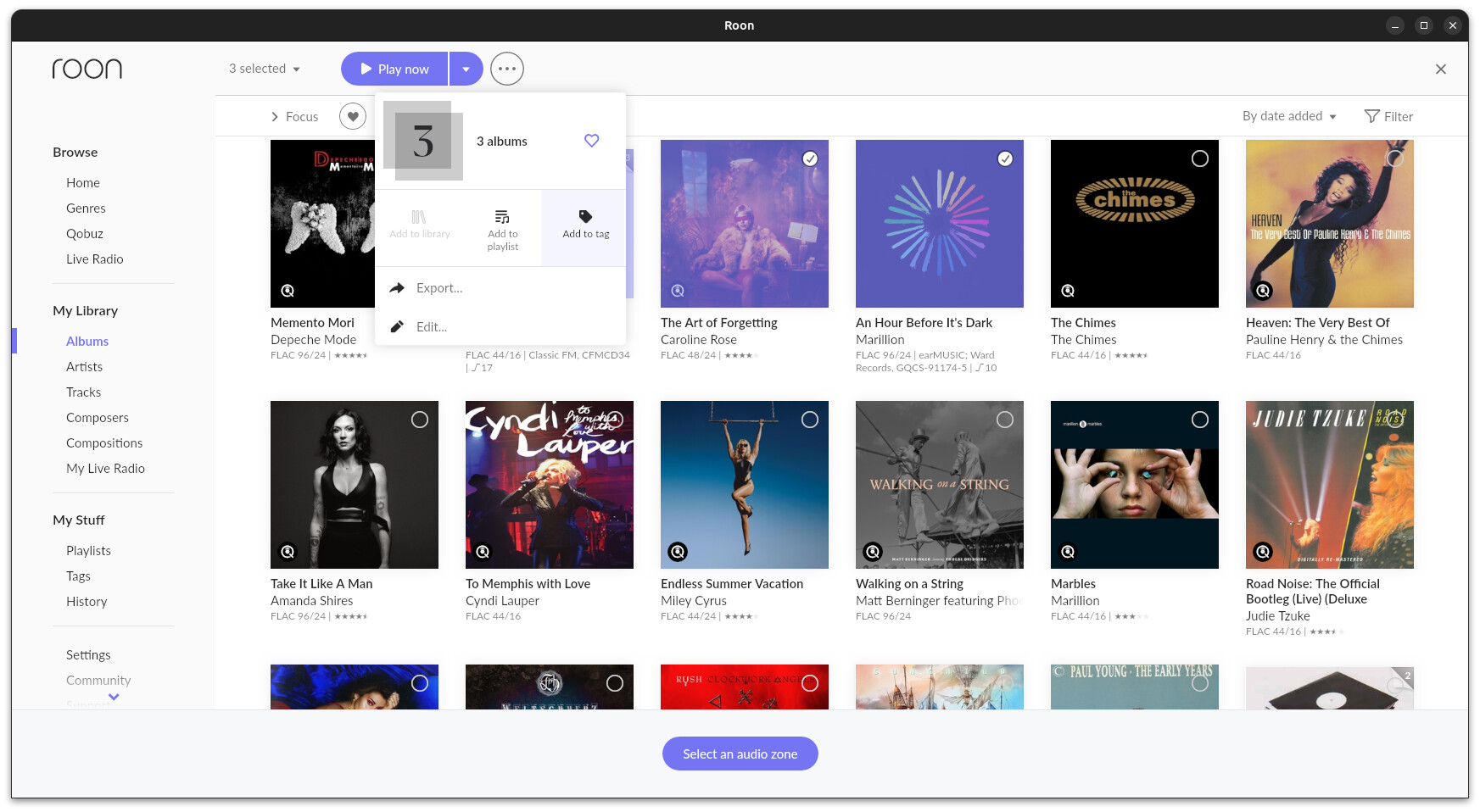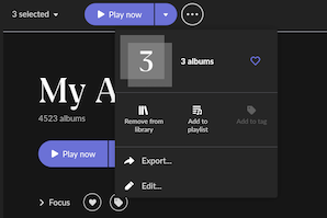 In Album View, when you select multiple albums from different artists and then the three dots edit menu, Add Tags is grayed out and you’re unable to add tags to those selected albums. If you select the same albums individually then you can add tags, no issue, and you can add tags to multiple albums at once when looking at an Artist Overview page. The issue only shows up in Album view.