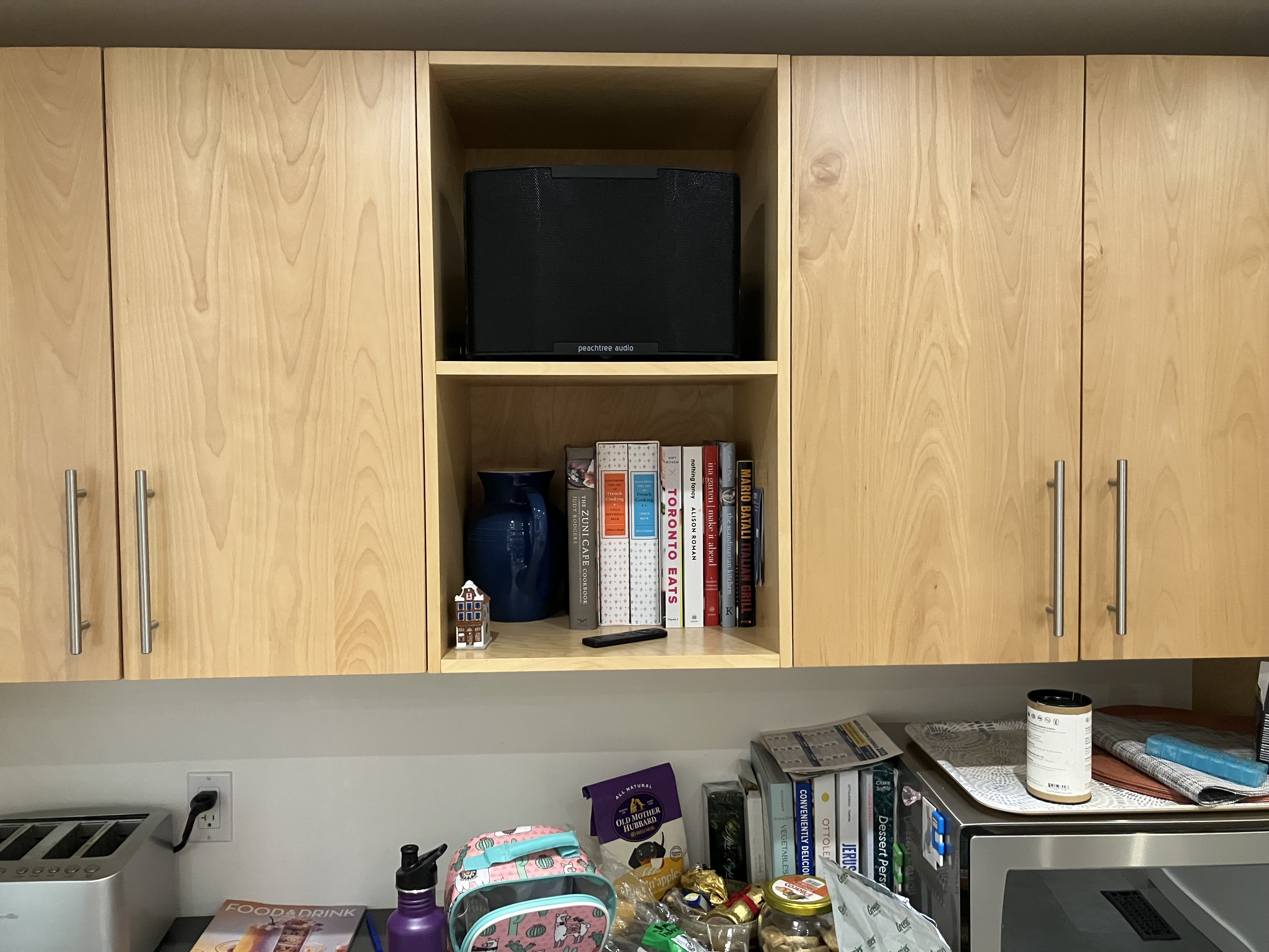 My speaker/amp in my kitchen is starting to fail and I am looking for a replacement option that will fit in this 16.5” wide by 14” high shelf.