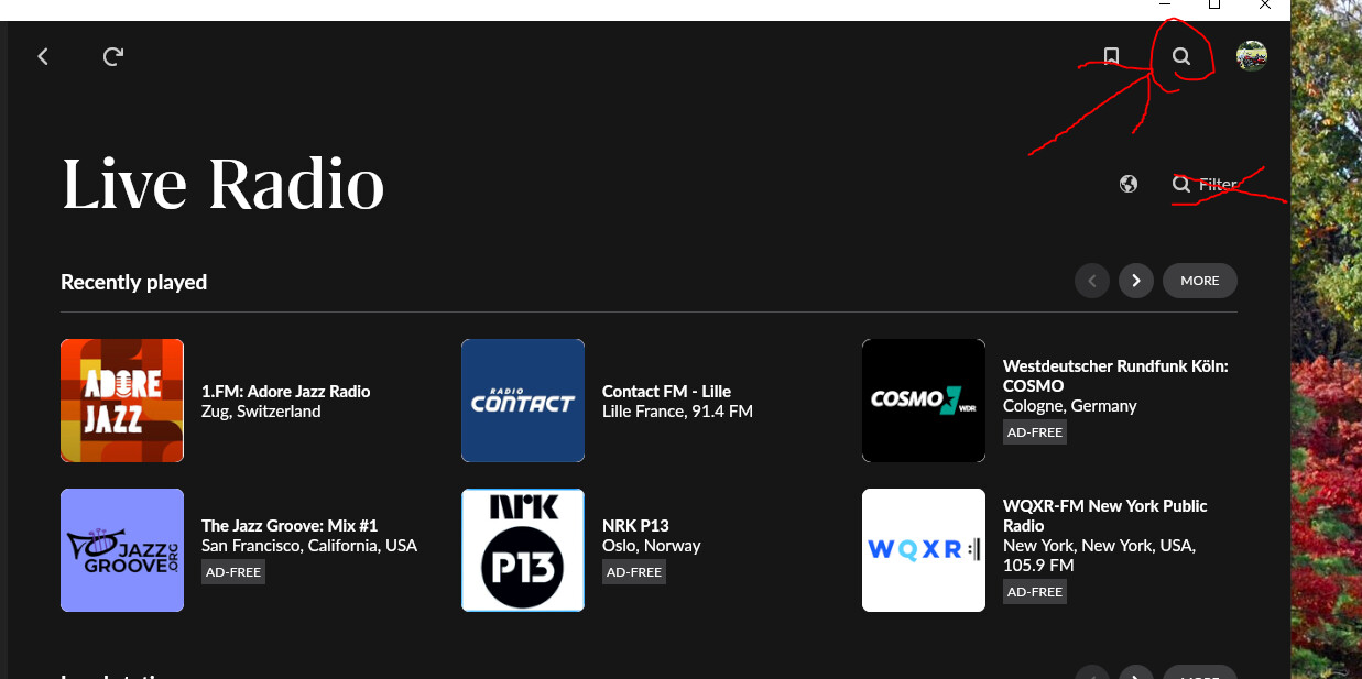 As well as following @bearFNF 's advice with the top right magnifying glass, did you also hit return? The drop down set of results do not include radio stations.