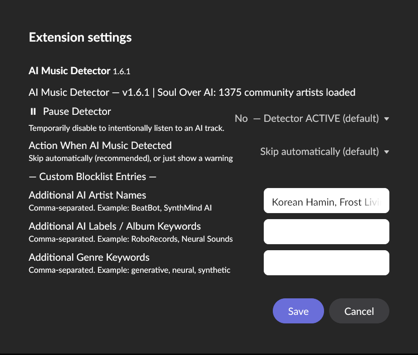 I’d welcome feedback, additional AI artist names to add to the built-in list, and any interest from developers in building a maintained successor to the Soul Over AI database specifically for streaming platform AI artists. That would make this extension significantly more powerful over time.