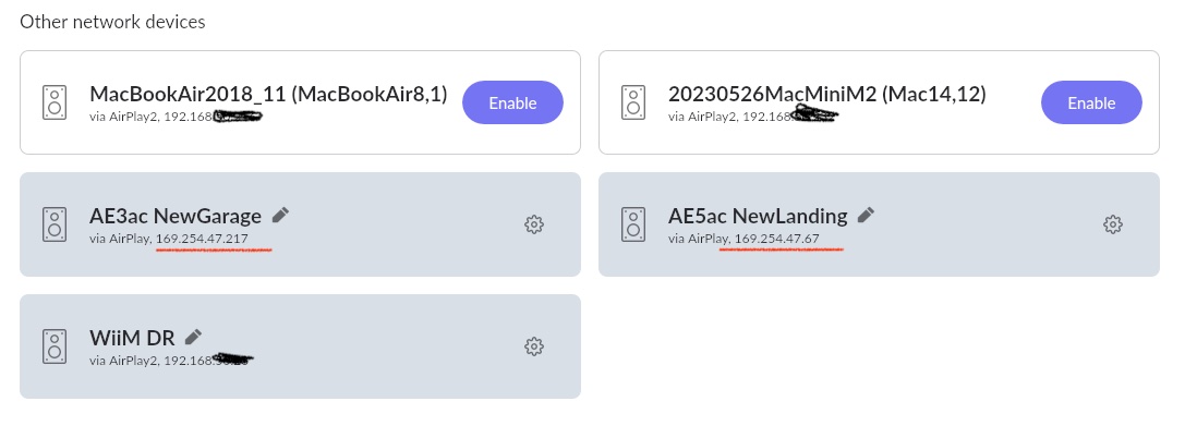 My AE has always been configured with a static IP in device via AirPort Utility. But it makes no difference, it still shows on 169.254.x.x. I got it working on AirPlay2 with Apple Home but it was flaky AF and every restart (I turn off the garage electrics at night) I got a ghost. So after a few ssh sessions to flush the mDNS cache I got bored of that and reverted AE firmware to AirPlay1. It has affected some functionality with how I most frequently use it, but on balance I can live with that because I don’t have to deal with it any more. Still showing on 169 but it works and no more ghost AEs.
