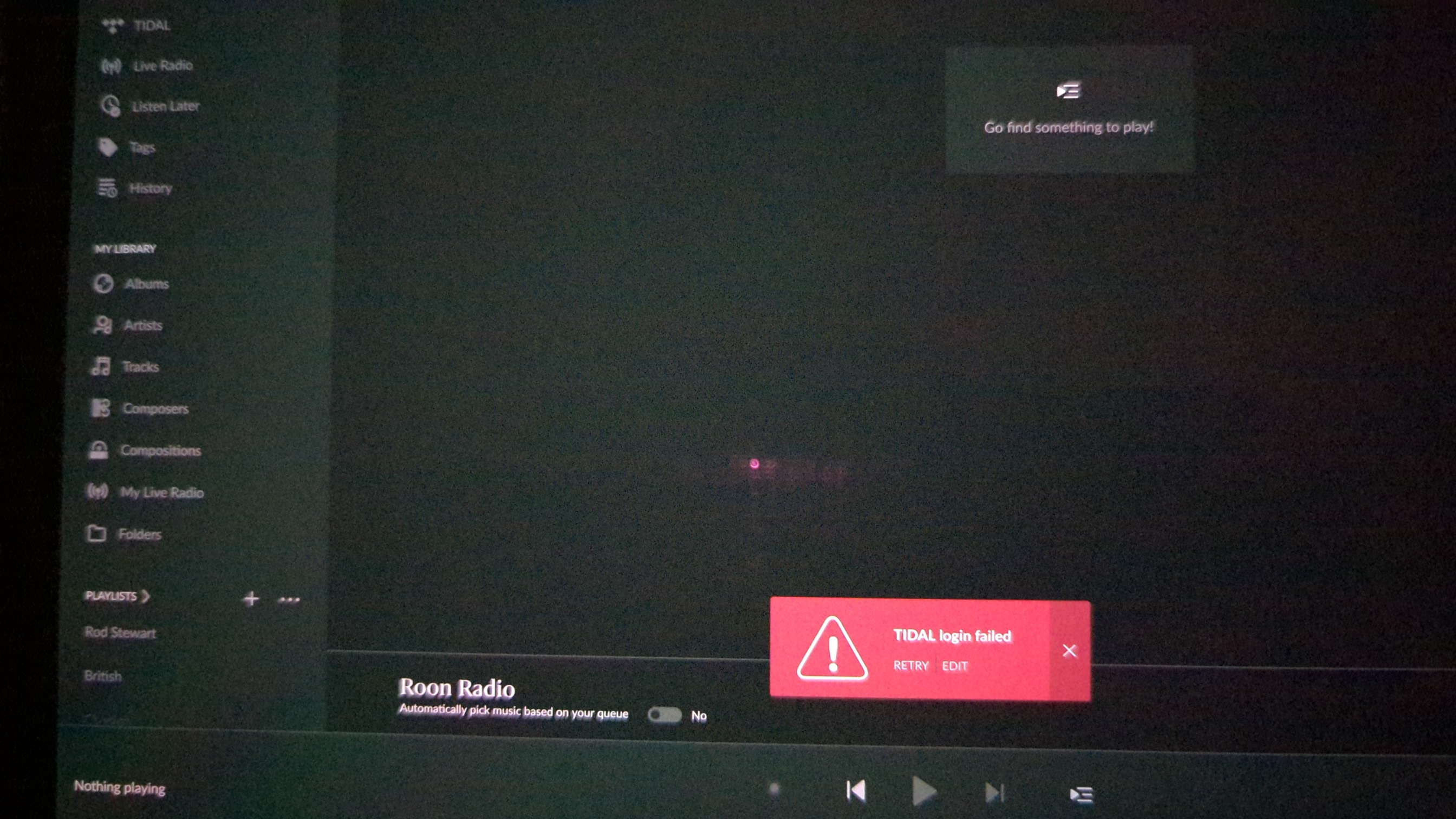 Describe your network setup. Tapping retry did nothing, and tapping edit shows Tidal waiting for Tidal login with spinning wheel.