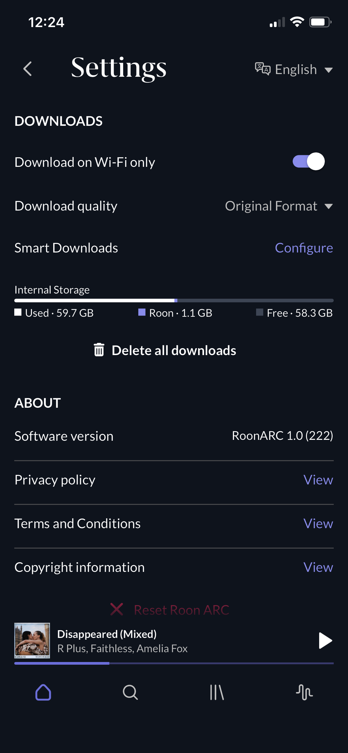 I then focused on deleting albums. The “Remove XX downloaded albums from device” seemed to be stuck and I don’t think it removed anything. I also could not individually remove one of the last (maybe the last) albums I downloaded. I was able to individually remove all other albums. It seemed to me that it was just the one album that was causing problems. I think at that point, even “Reset Roon ARC” seemed to do nothing.