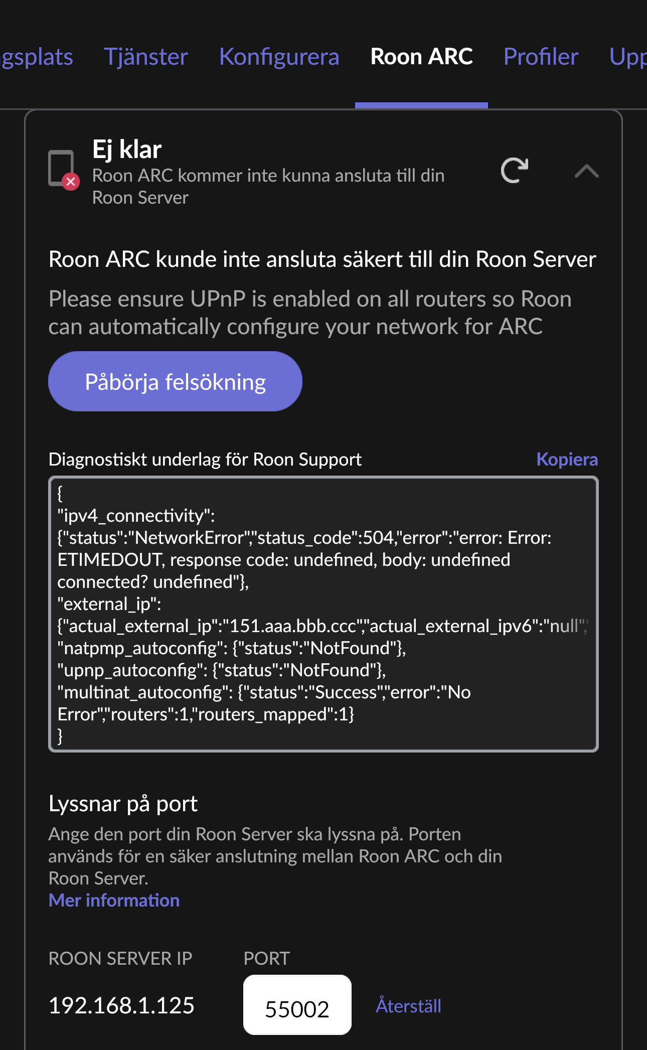 Make sure the IP/Port matches the Port listed in Roon → Settings → ARC