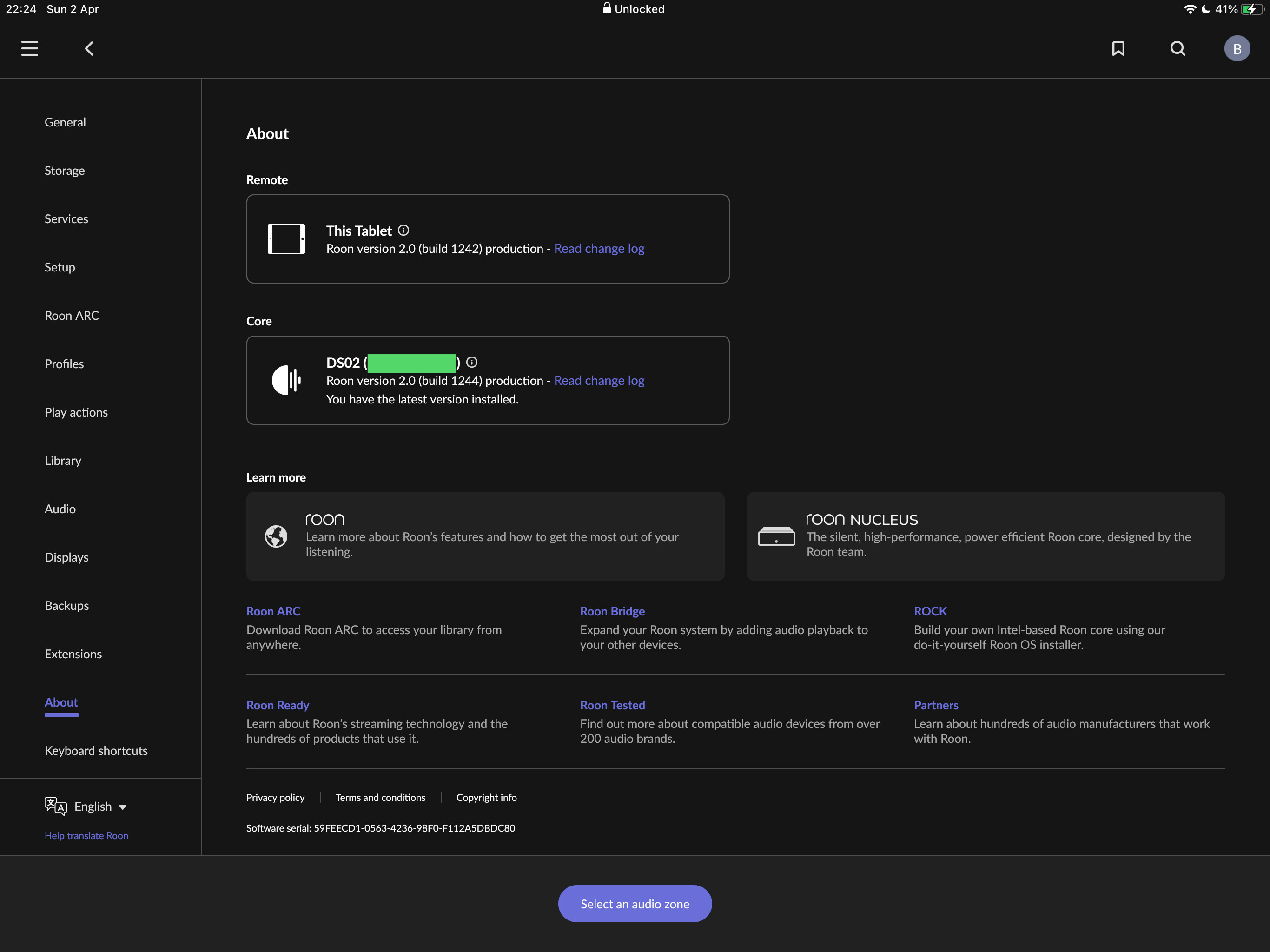 | Roon / RoonServer | 2.0 (build 1244) production |