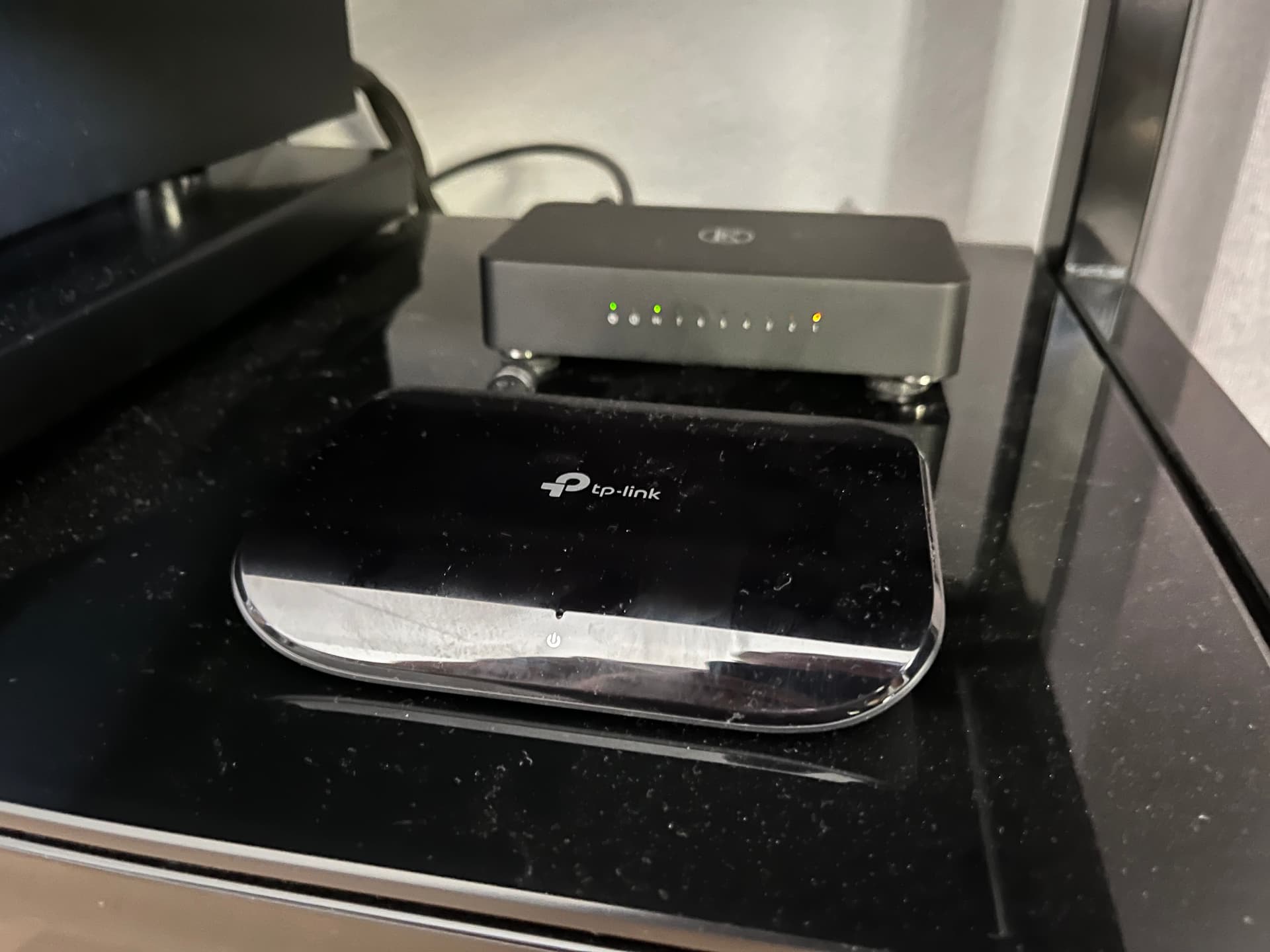 The TP-Link is so ridiculously light weight that I think I’ll try some other cheap switch with 5V power input and metal housing just to make it sit still. It’s unfortunate that so many five port switches have power input on other side of the unit and ethernet ports on another. Impossible to fit the switch nicely on av-rack. Zyxel would fit the bill otherwise but is wrong color (silver).