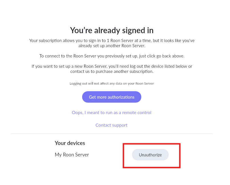 The strange thing is that it normally says „your subscription allows you to sign in to 1 Roon Servers at a time“, like here (and shows the Unauthorize button):