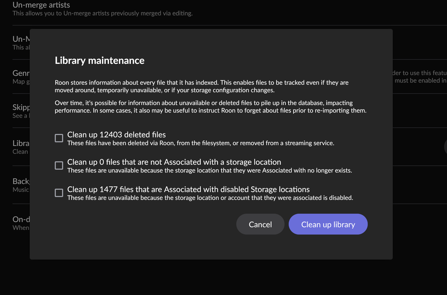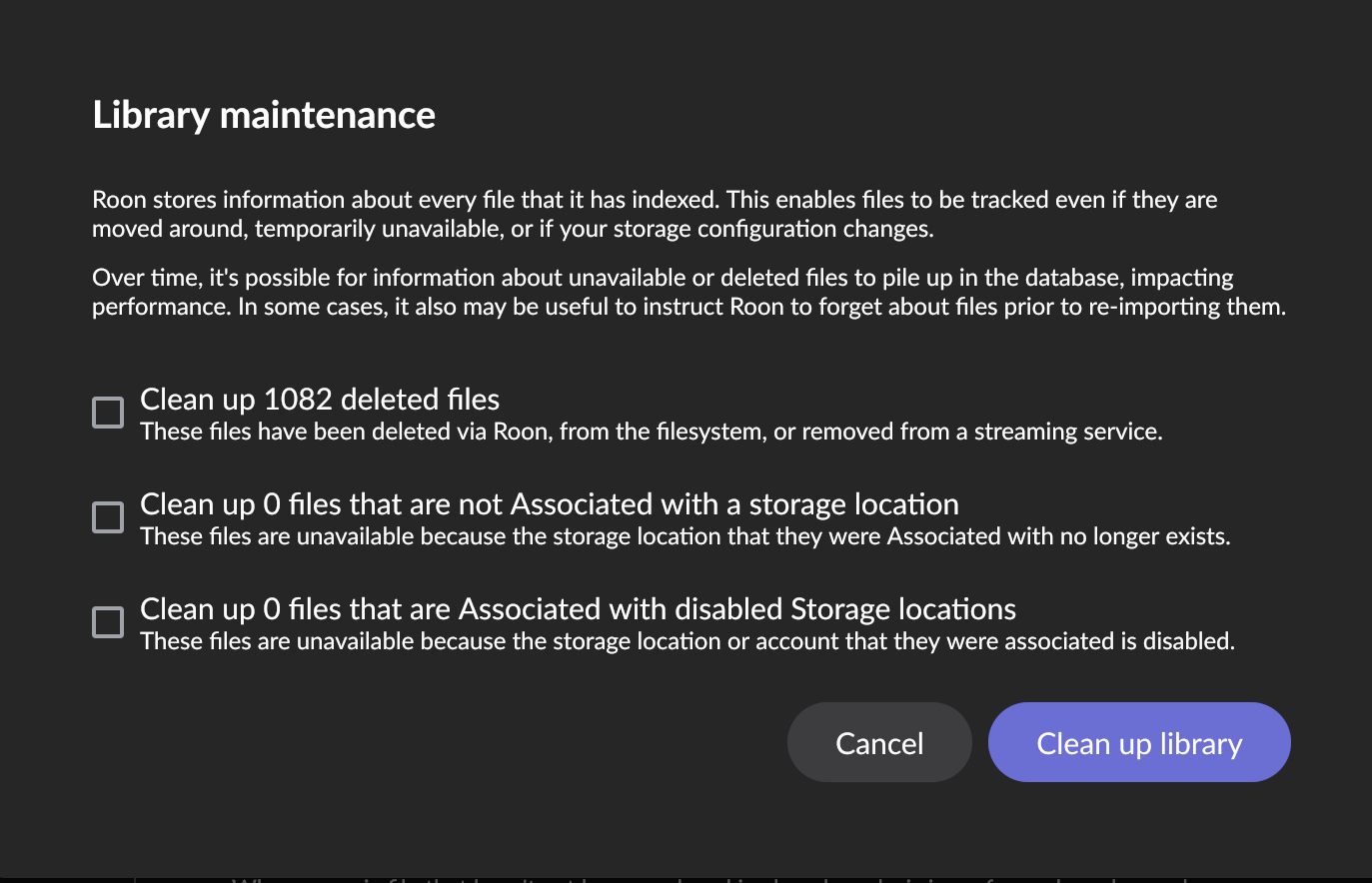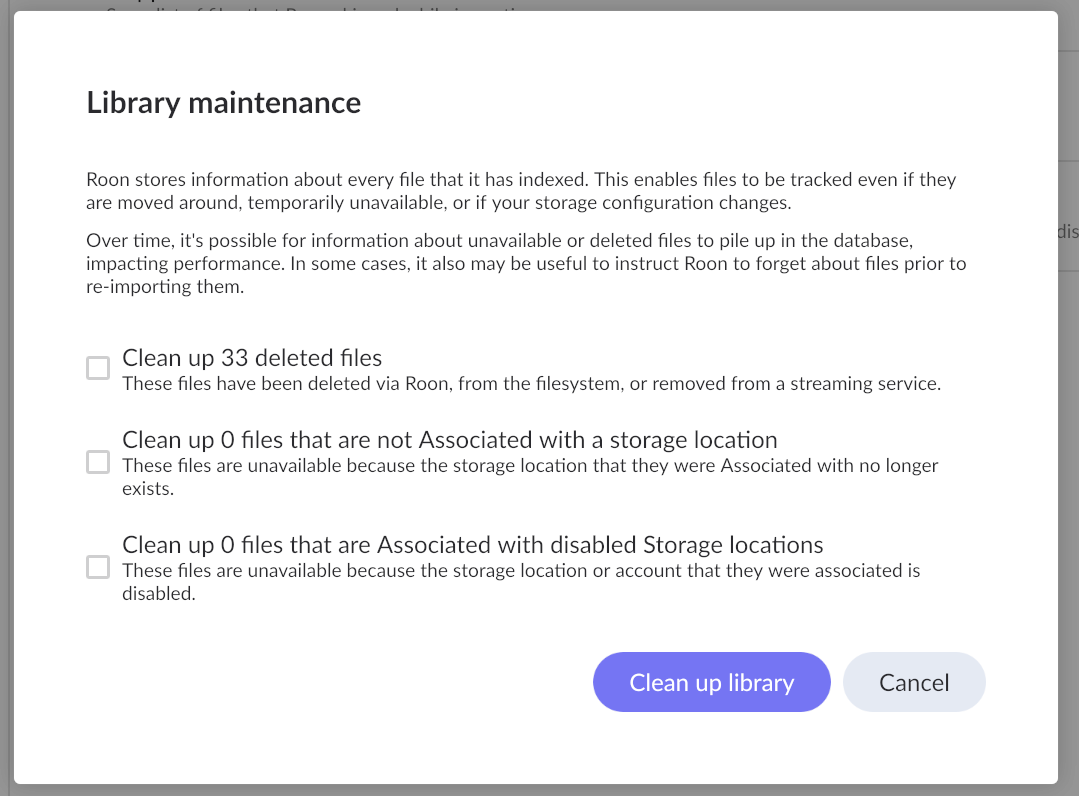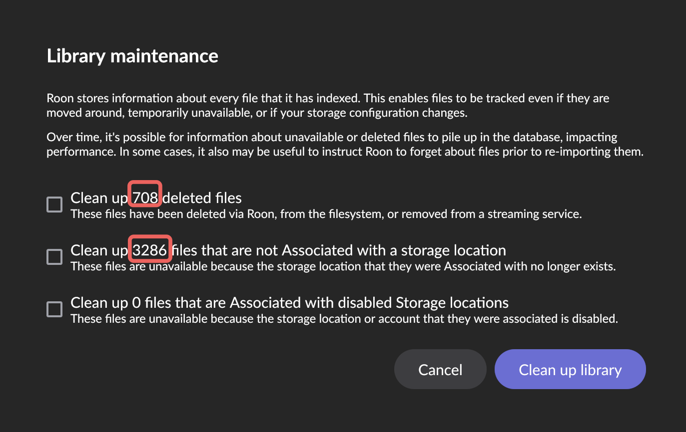 Indeed. I have had this message for a longer time, not sure how long, for 492 files. That may be Qobuz deletions or whatever, but I have never dared clicking the Clean Up Library button. There should be a List Files button so that I can check before deleting anything. Even if itās inevitable Qobuz deletions I would like to know what they are