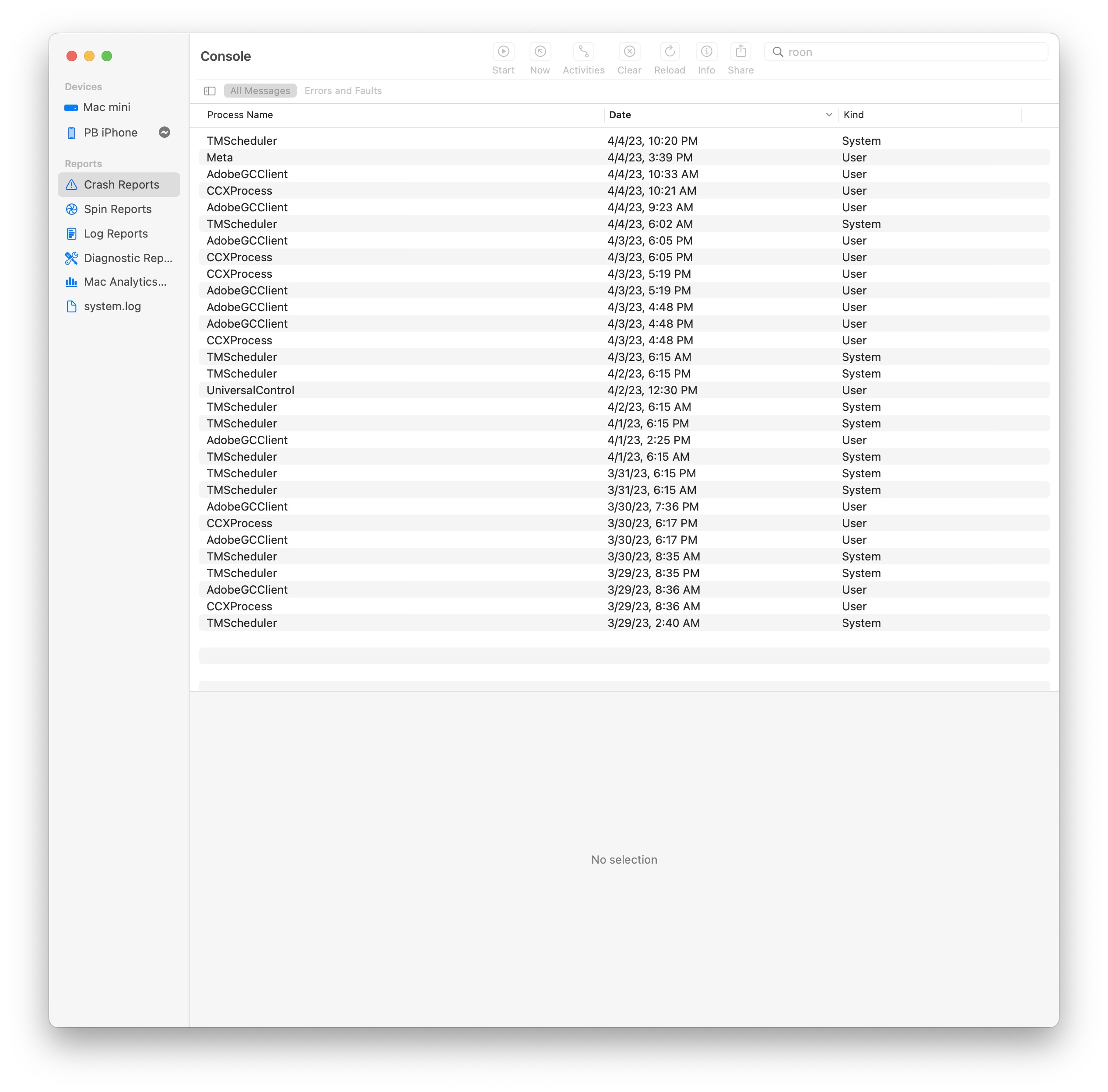 Hey @oleh. Are you using a previous version of MacOS? I’m using OS 13.3, and Console does not display the same categories in the left-hand pane as you’ve shown. However, there’s now a separate heading for “Crash Reports.”