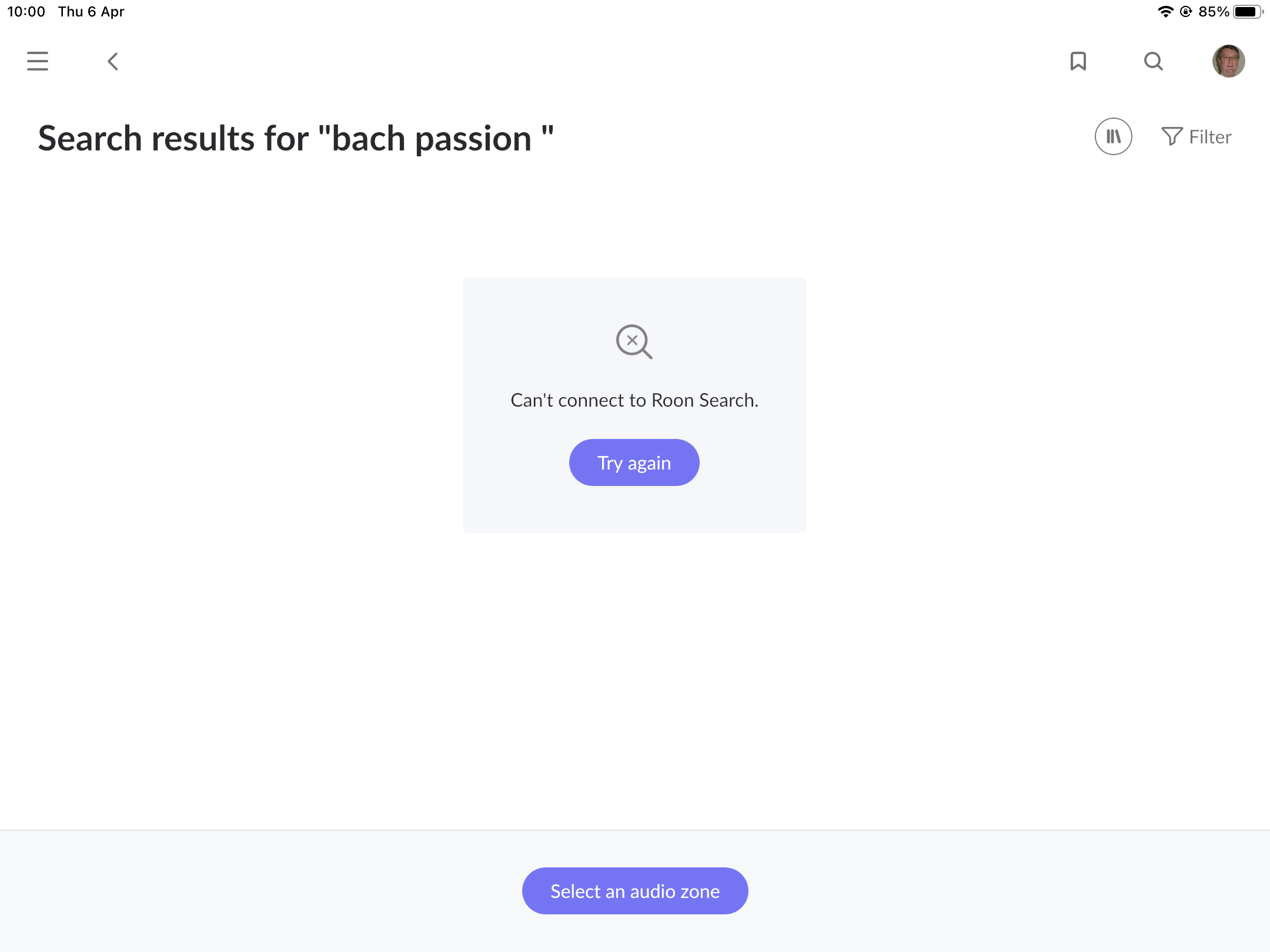 Have just installed 1253/ARC173 and am having issues with the Search facility. I typed in Bach Passion and a drop down list pops up with all the versions of Bachs Passion I have in my Library. But if I hit the “see all results” button, a screen pops up saying “Can’t connect to Roon search - Try again” . I have tried the search on other Artists/Composers with no problems - it just seems to be this one!
