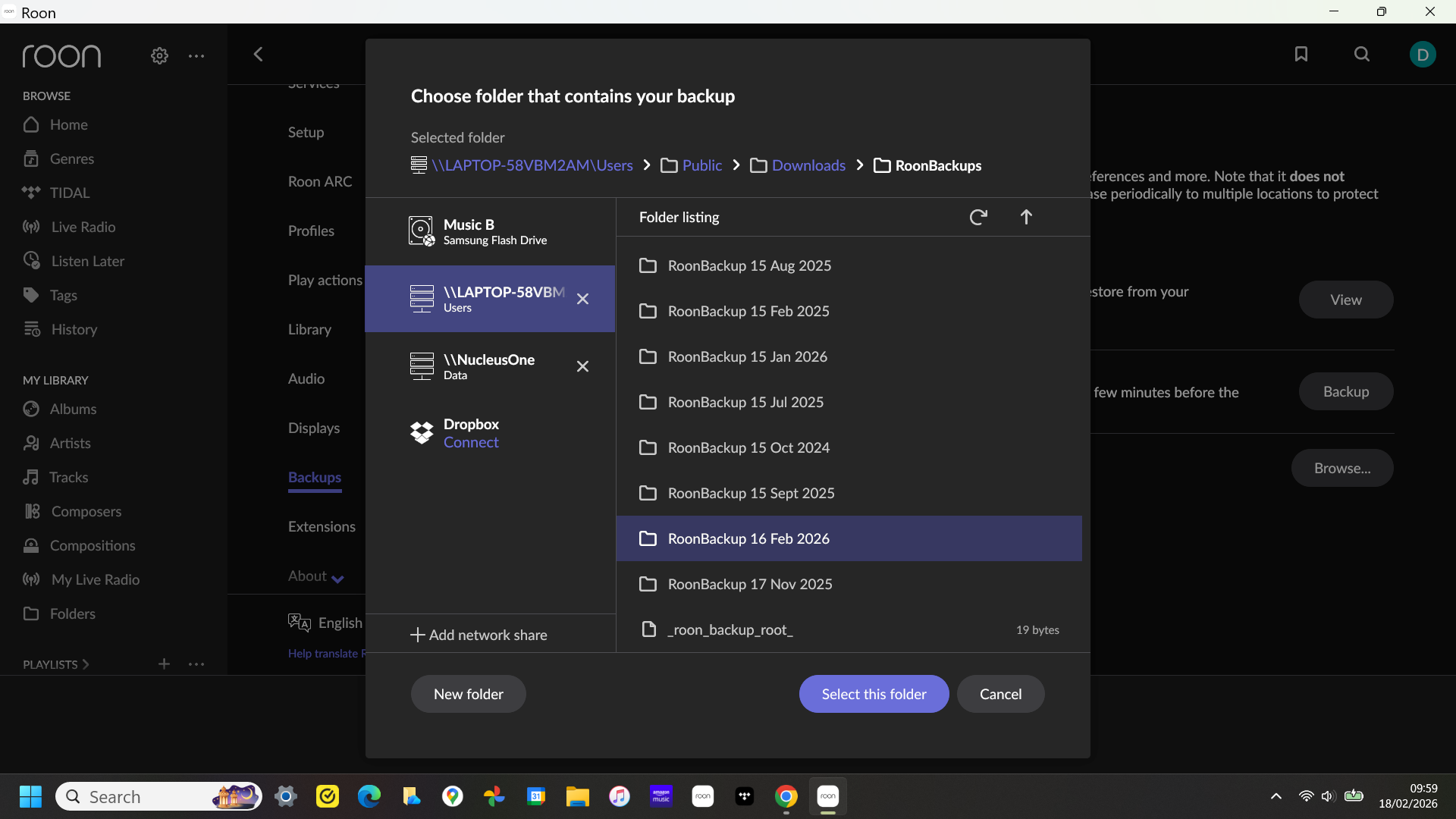 Trying to restore Roon backup on Nucleus One: copies of that currently held in both laptop folder and on USB stick. They were created from Innuos Zen Mini with same Roon build number.