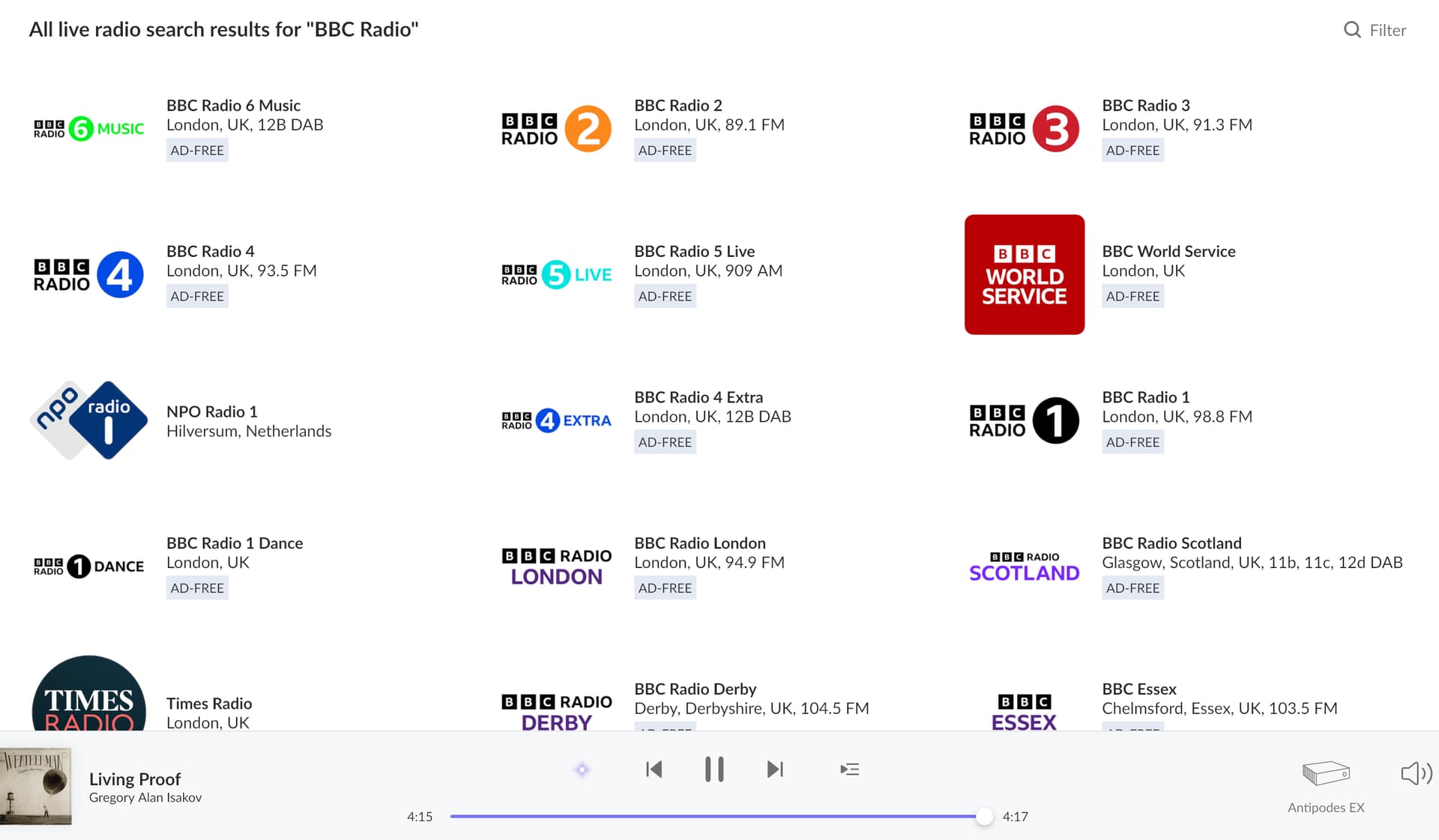 Also, you may be able to find this station by clicking on Live Radio in Roon’s sidebar, clicking the large Locations button that appears below your recently played and local stations, clicking United Kingdom, and then clicking London. You can alphabetize this listing by clicking the More button in the upper-right corner and changing the sort order from By Popularity to By Name.