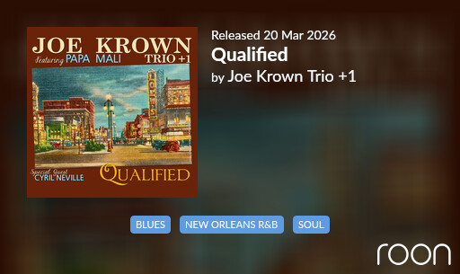 Qualified is a vibrant tribute to classic New Orleans music, steeped in the rolling piano rhythms and soulful styles of Allen Toussaint, Dr. John, Professor Longhair, and James Booker. Eight classic New Orleans songs and three fresh originals come alive with Joe Krown’s masterful, rolling piano work and Papa Mali’s gritty, soul-soaked vocals. And featuring a very special guest appearance by Cyril Neville, delivering a soulful, original take on the Toussaint classic “Fortune Teller”. [Valley Entertainment]