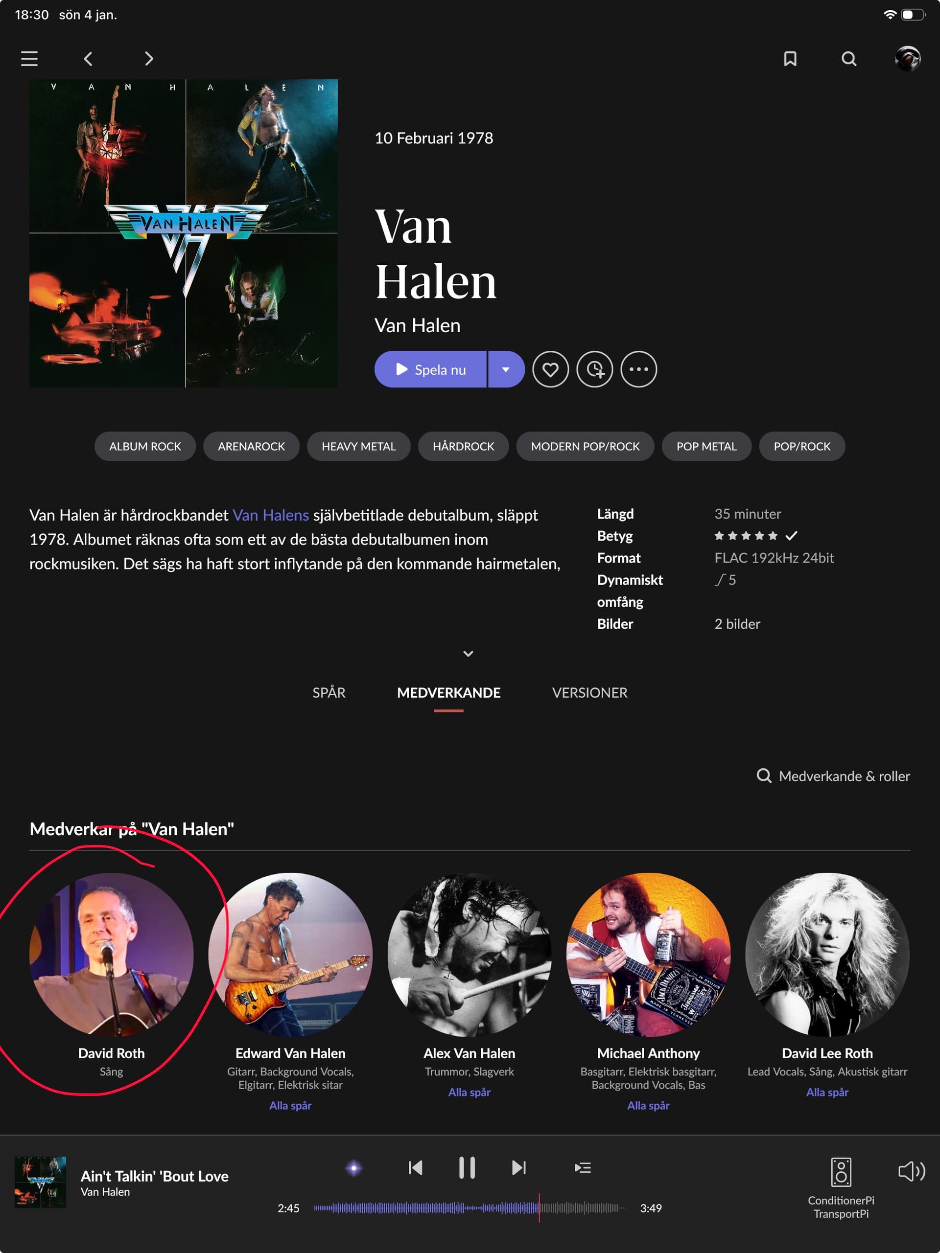 Roon uses multiple sources for metadata, and I think the David Roth attribution may be coming from somewhere else, not TiVo. Qobuz also uses TiVo, and its credits for the Van Halen 1978 album doesn’t include David Roth.