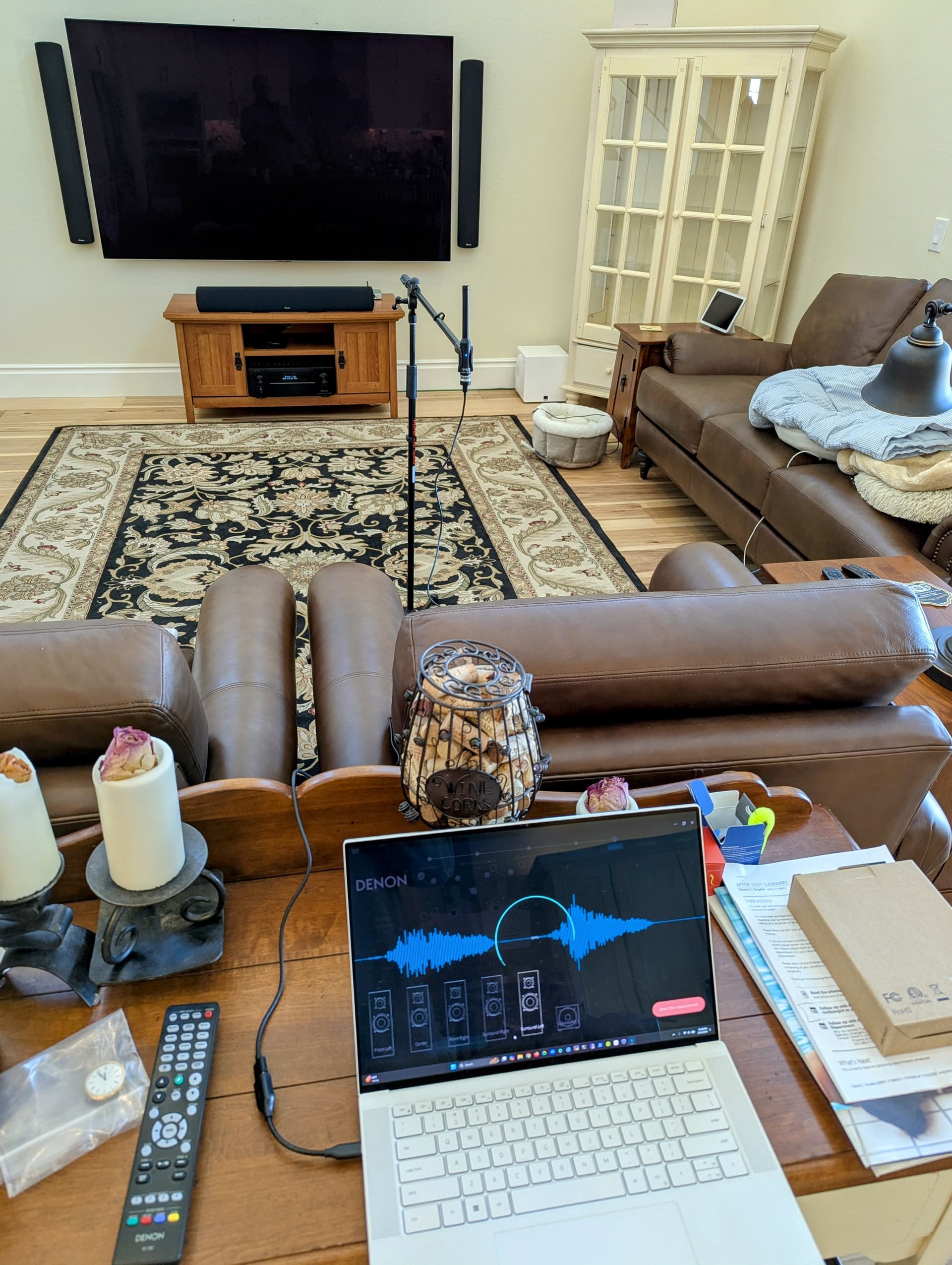 This past weekend, I replaced the 7-inch 2-ways (just there temporarily) with GoldenEar SuperSat60 on-wall speakers and a SVS 3000 Micro sub. I completed a Dirac Live calibration using a Denon AVR-X4800H A/V receiver and miniDSP UMIK-2 mic with custom calibration file from Cross Spectrum Labs. Creating a good calibration in a reverberant room is as much art as science, but I ended up with something that sounds pleasing and reasonably correct after three tries. I had an audiophile friend over yesterday to get his thoughts, and he said it’s the best sounding surround system he’s ever heard and reiterated his assessment via email the next day. I’m looking forward to having him back after I add treatments!