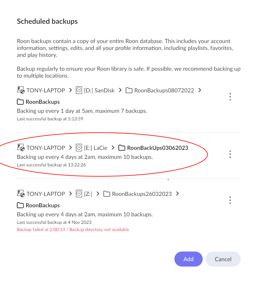 @Ivan, I already posted the error message I get when I attempt a backup. See above. I get “Uh, oh, something’s not right”. Roon then hangs, becomes unresponsive and I have to re-boot. For the moment I have given up any further backup attempts.