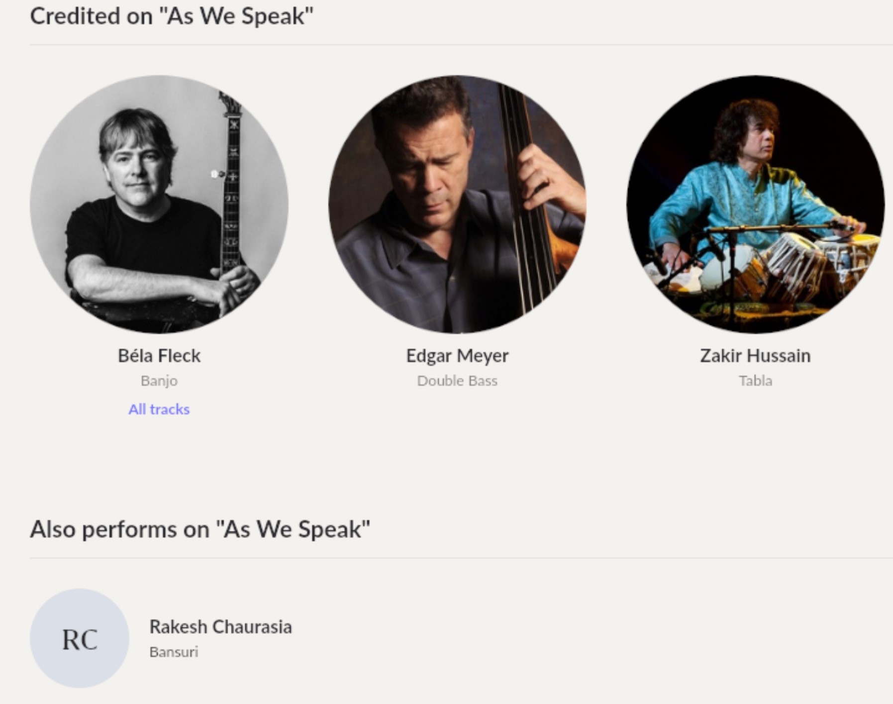 The original metadata for the Album “As We Speak” shows Bela Fleck as the primary artist. I could add a credit for him for “banjo”, for Edgar Meyer for “double bass” and for Zakir Hussein for “tabla”. However, when I try to add a credit for Rakesh Chaurasia for “bansuri” it creates a blank artist record without connecting to Roon’s artist entry for Rakesh Chaurasia, which shows his picture, biographical info and discography.