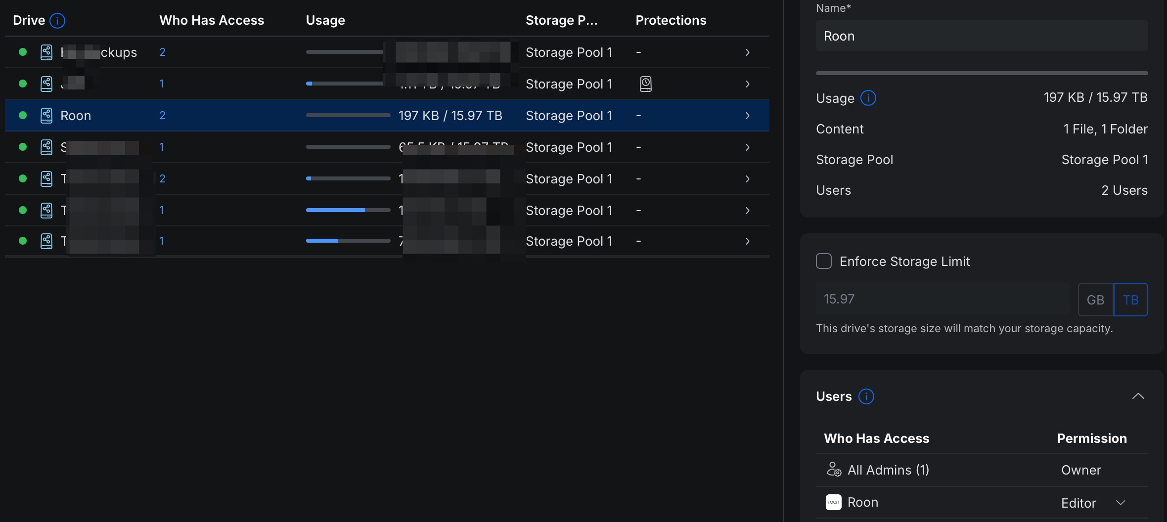 This is the Admins & Users page of the NAS control Panel, with some details redacted. It shows the Roon user that I created for the Roon automated backups