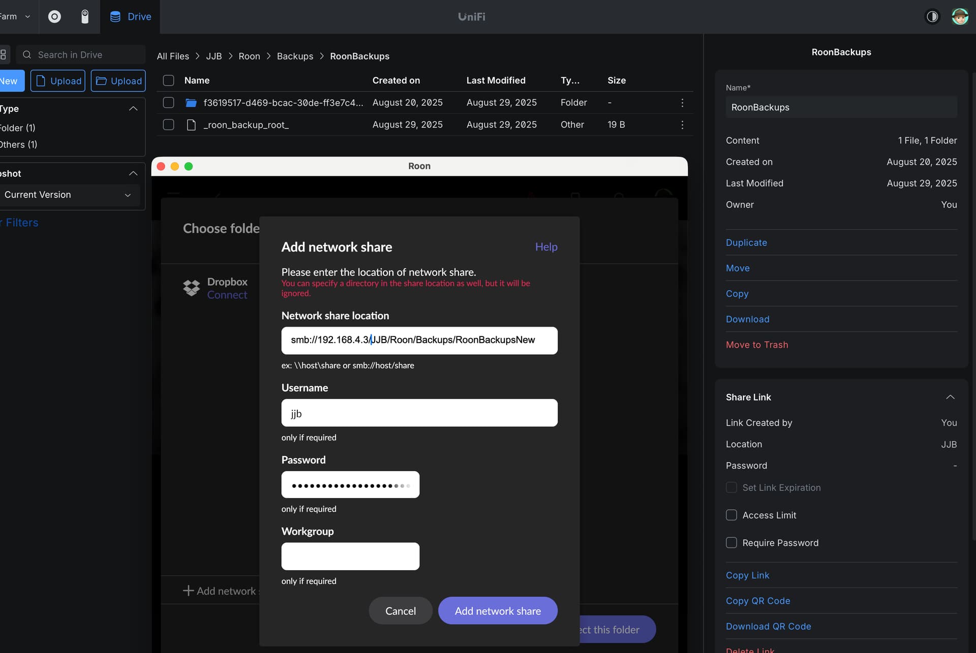 The first screenshot shows the Roon Backup page on top of the Unifi NAS page showing the folder path where I want the backup to go, and the second shows that the smb://192.168.4.3 is (hopefully) correct.