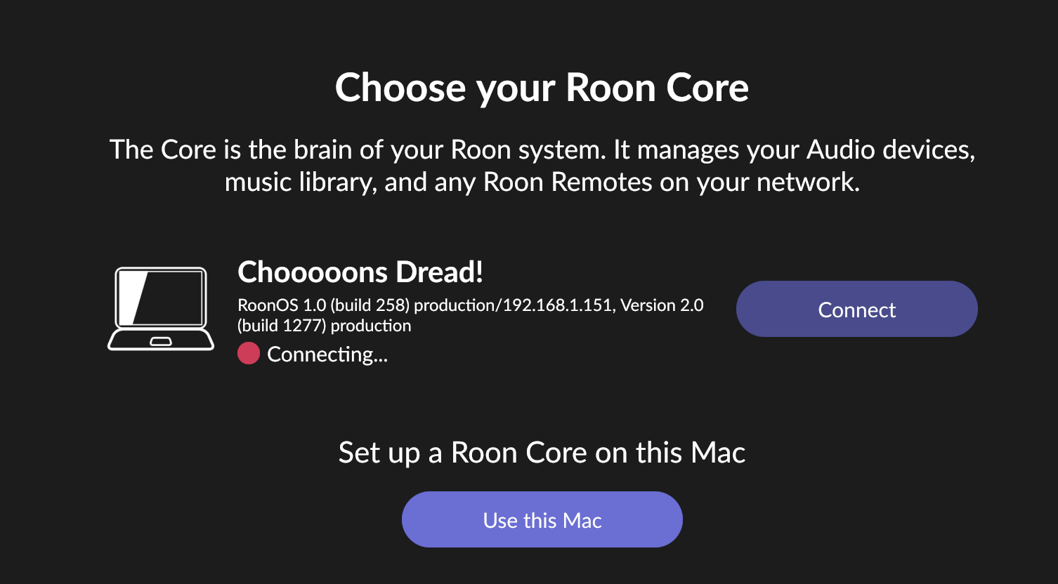 Rebooted the ROCK (Intel NUC) but makes no difference! It’s on the network and seen by the Roon app running on my Mac but won’t connect. (I’ve attached a screenshot)