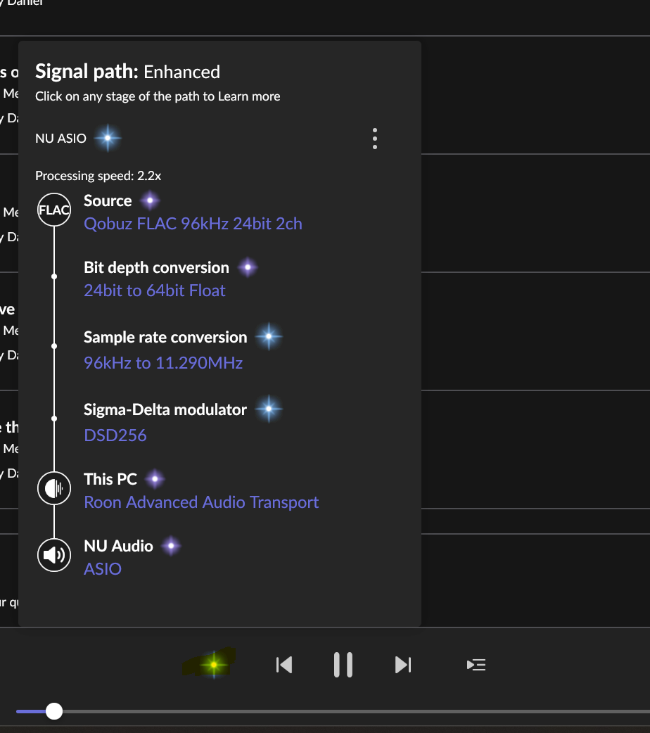 Great I can live with that if it shows DSD. Thanks for the heads up. I figured signal path meant the same thing as signal chain. I have seen that. I now have the Eversolo working to display the screen and output to my Musician Pegasus via USB. I had to also switch the Eversolo to DSD over PCM, along with my Pegasus and IPhone before it played music. Here is my signal Path:
