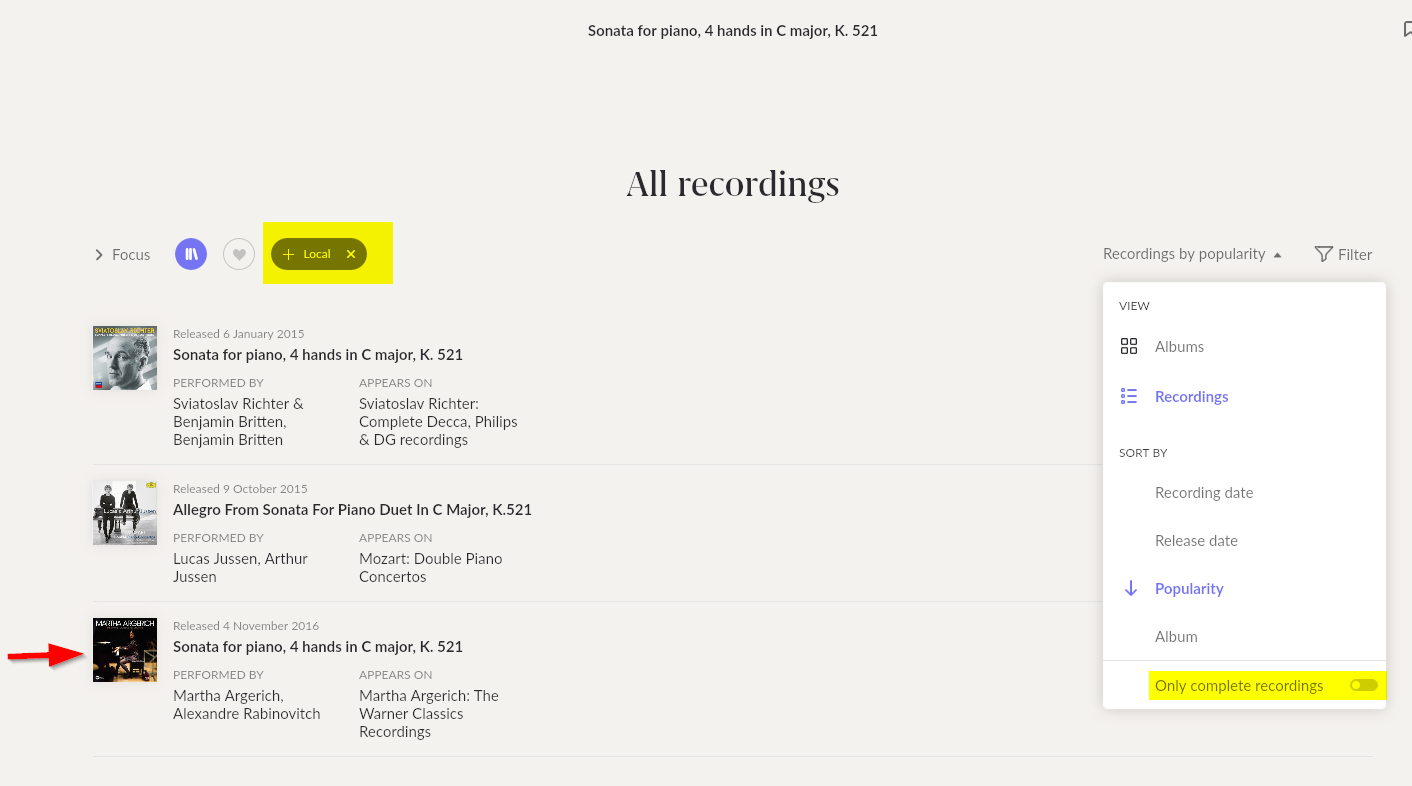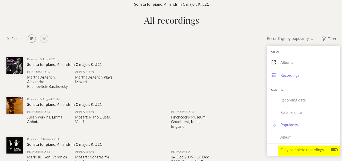 One possibility is that two composition entries exist for what is actually the same composition, and each one shows a subset of the available recordings. In this case, you can go to My Library > Compositions in the side bar, select them both, and merge them