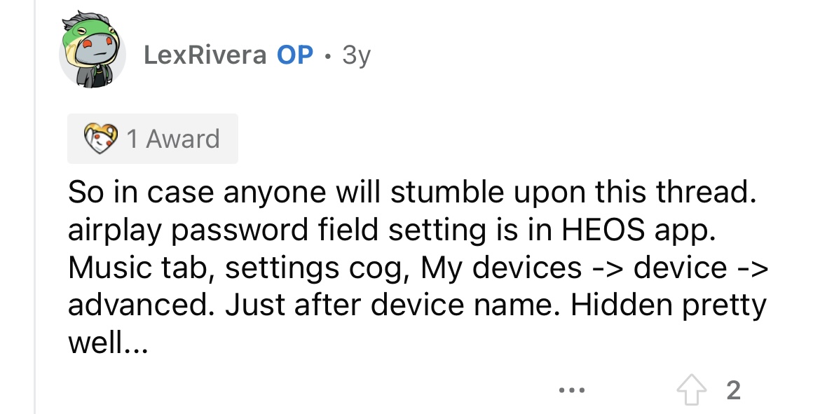 I can see the Marantz in my Roon’s devices list. When I trying to connect via AirPlay Roon asks me the Marantz’s AirPlay password, but there is no AirPlay password on my Marantz. I can’t find! There is no any info how to find this password. Maybe someone knows?