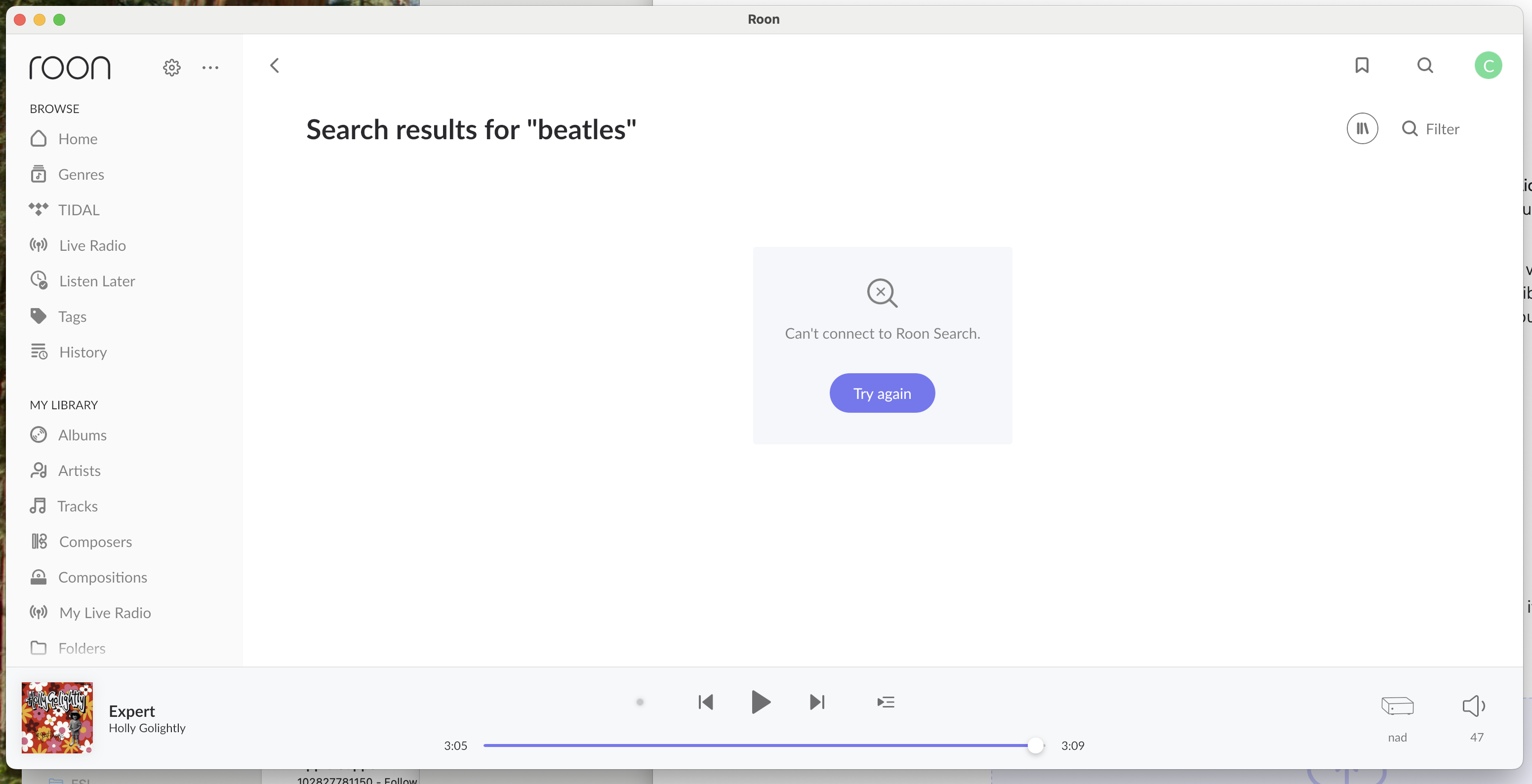 - inside the dedicated Qobuz section in Roon, the interface often does not load results or appears to be “disconnected” from Qobuz,