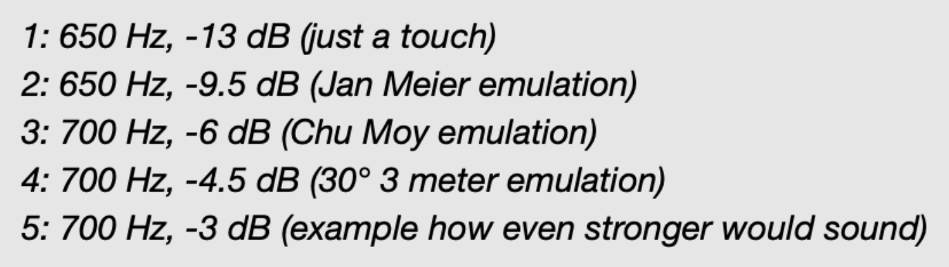 Here it is quite apparent that the lower the dB number the lower the crossfeed effect is supposed to be. Jan Meier’s setting with -9.5 dB is supposed to be a very minimal crossfeed implementation.