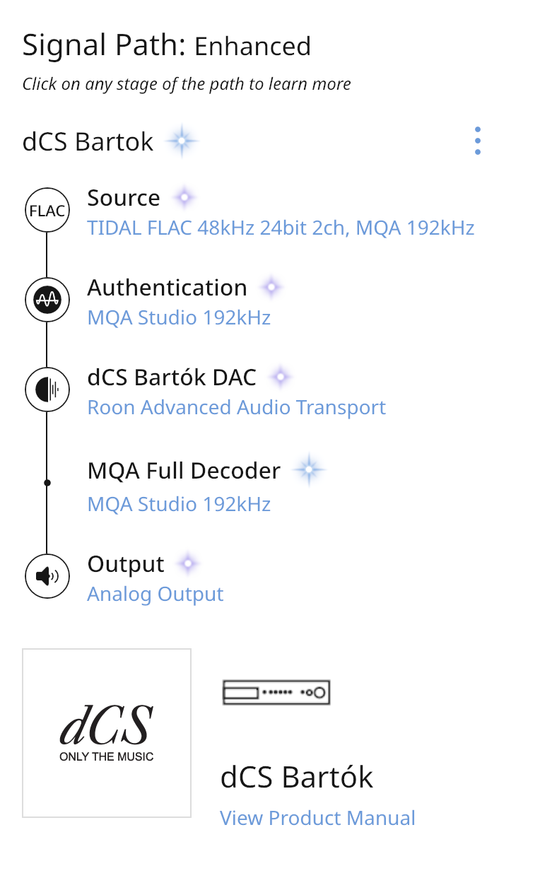 My interpretation (which may be wrong) is that the first signal path (including the word ‘Enhanced’) is indicating that in this case MQA decoding is being carried out by Roon, and an ‘enhanced’ data stream is being fed to your Bartok. The second signal path indicates that a bit-perfect (lossless) stream is being passed to your Bartok, requiring the Bartok to carry out the MQA decoding.