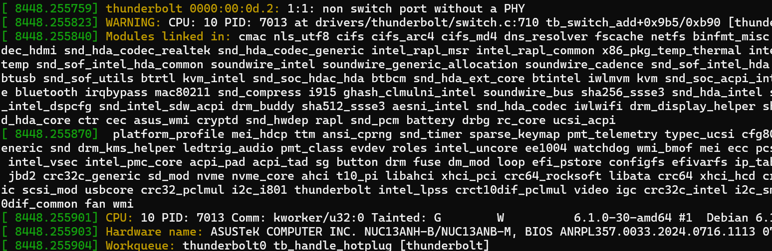 Weird. I don’t know much about Thunderbolt, but this is something on the kernel level. Hence you could try to install the newer one from Bookworm backports: