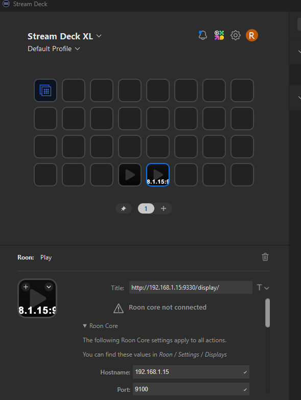 Based on that screenshot, it’s likely that you need to enter 9330 (instead of 9100) for the Port value in the Roon Core section. This is based on the assumption that you pasted in the “Web display URL” from Roon in the Title field for the shown button.