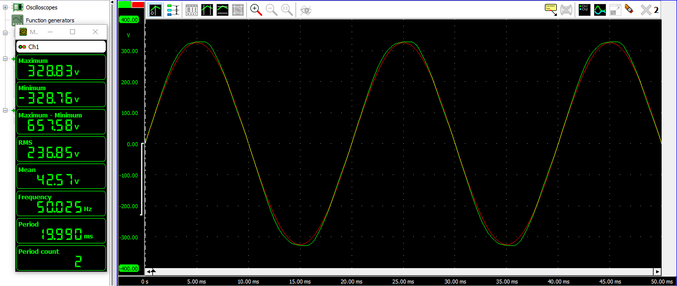 Red is ideal sine wave, green actual. Very good as you can see: