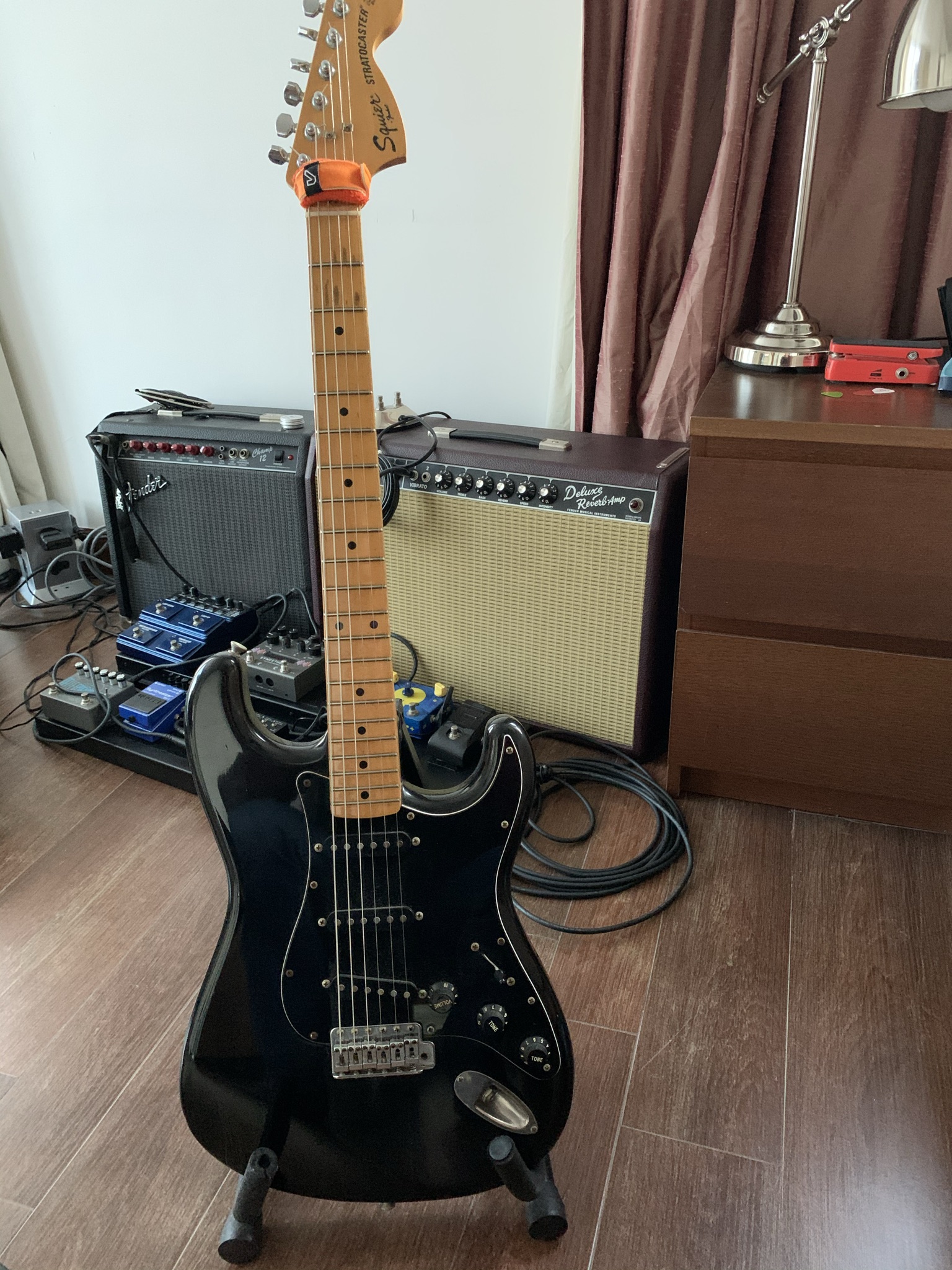 My 1984 Squier Stratocaster, an 18th birthday present from my parents. I’ve played poorly, but enthusiastically from my early teens onwards. I now have the funds for much better equipment, including a “proper” Fender Stratocaster, but I’ll never let go of this one.
