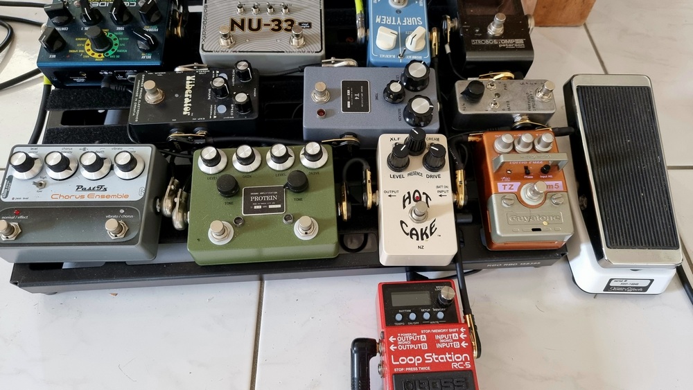 I think there are 3 different pedals on there from my last post. The Accountant (compressor), might only be a mini pedal, but not small in price, vintage Guyatone ‘torrid fuzz’, viny engine (sort of lo-fi chorus/vibrato modulation) & I think there’s a second isolated power supply under the board, whereas at some point I only had one and used to ‘daisy chain’.