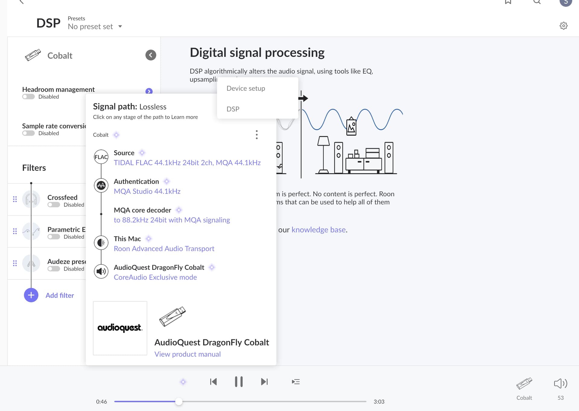 My settings for the Cobalt in Roon are: exclusive mode ON, device set to Renderer Only and MQA core decode ON. This works as expected. These are the same settings for all my remotes on iPhone, iPad and Macbook.
