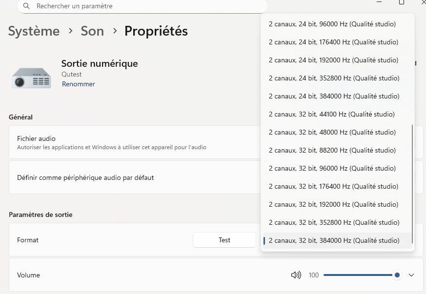 FYI,in W11 for Qutest->Parameters->System->Sound->Properties->Output settings->Format : 2 channels, 32-bit, 384,000 Hz (studio quality)