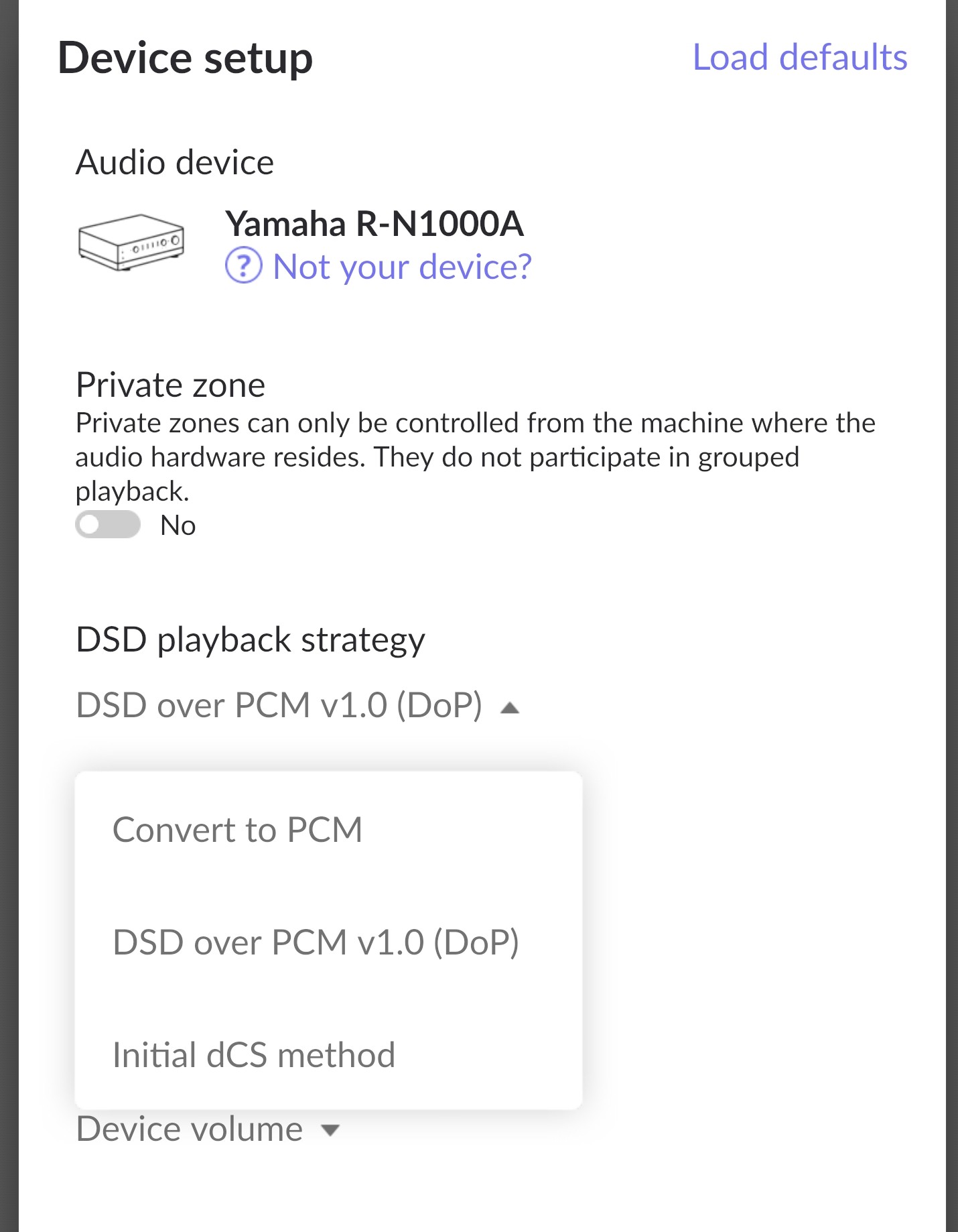 Can you please review and share a screenshot of: Roon → Settings → Audio → [Your Yamaha zone] → Device Setup → Show Advanced → DSD Playback Strategy.