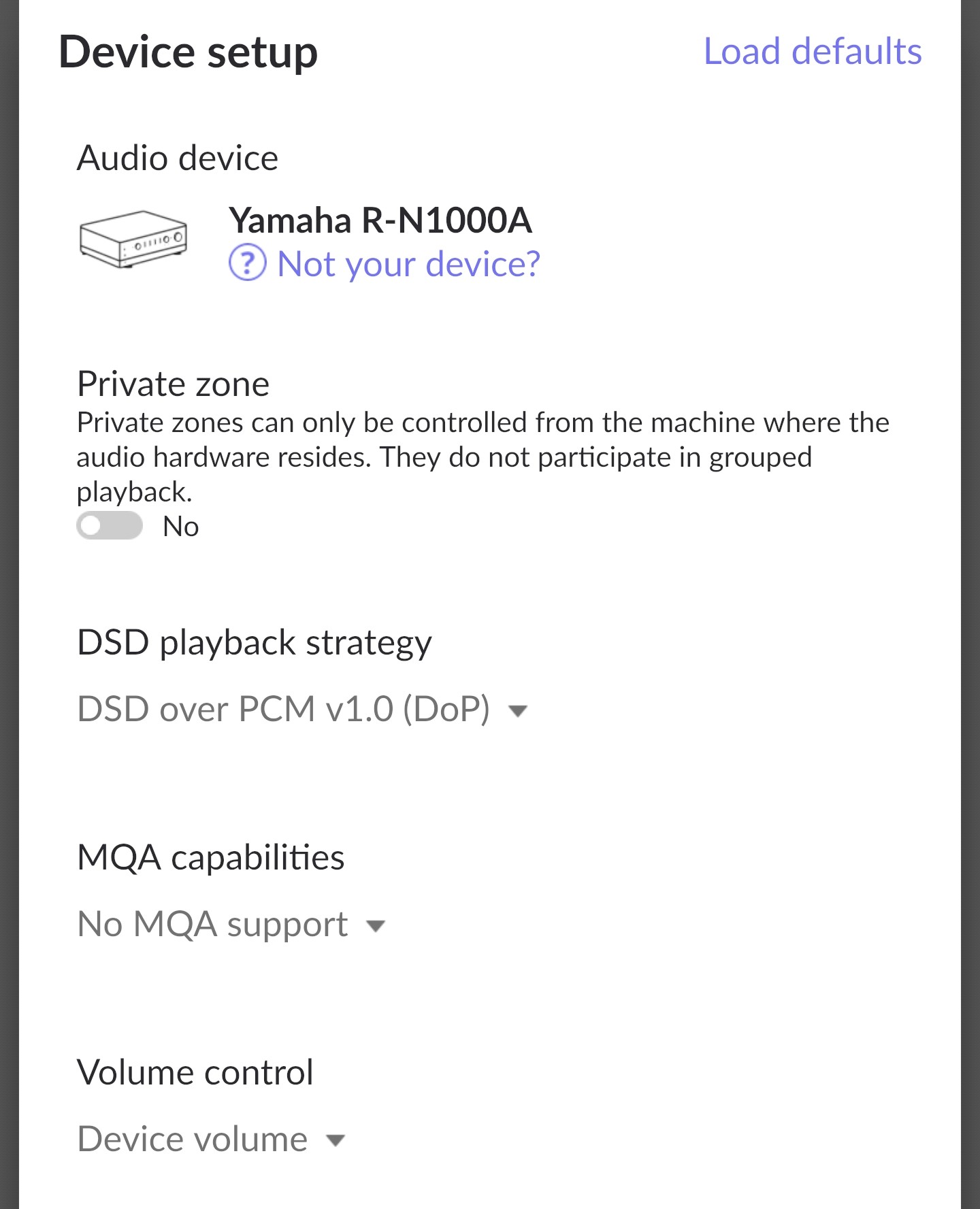 Is there a way to configure this for the Yamaha R-N1000? DSP Volume set 0 db means change strategy like Device Volume with out any changes. When DSP Volume set higher than 0 db set DSP Volume scheme and do anything like dsd to pcm 352.8 khz. Right now I must change from dsp volume to Device volume for listening dsd files without any changes of Bitrate.