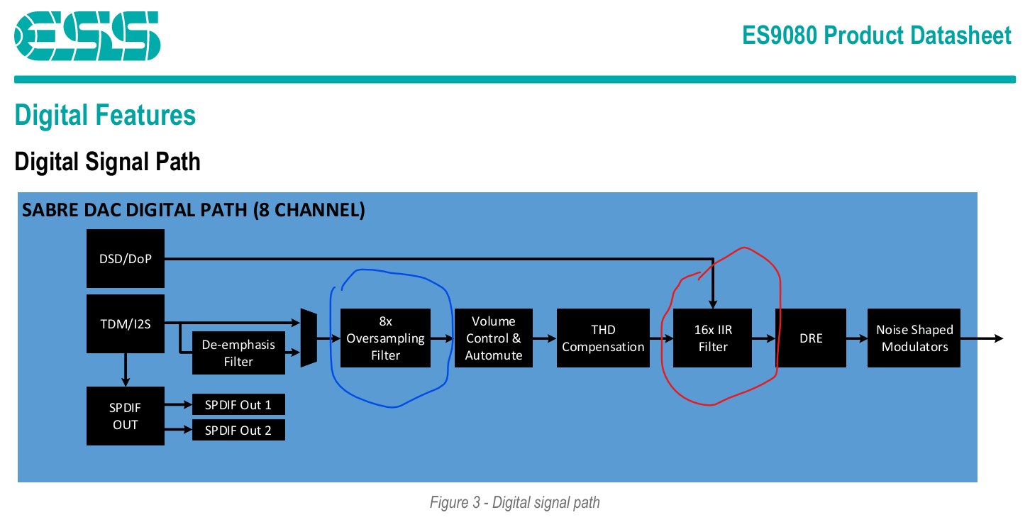 To be fair, I don’t think the conversion to 352.8 kHz PCM is going to degrade the sound in any audible way. I bet this signal bypasses the ES9080Q DAC’s internal 8x up-sampling filter (marked with blue) and goes only through the IIR filter (marked with red) and modulation. Note that DSD also goes through the IIR and modulator, so you’re not really getting 100% “native” DSD playback anyway.