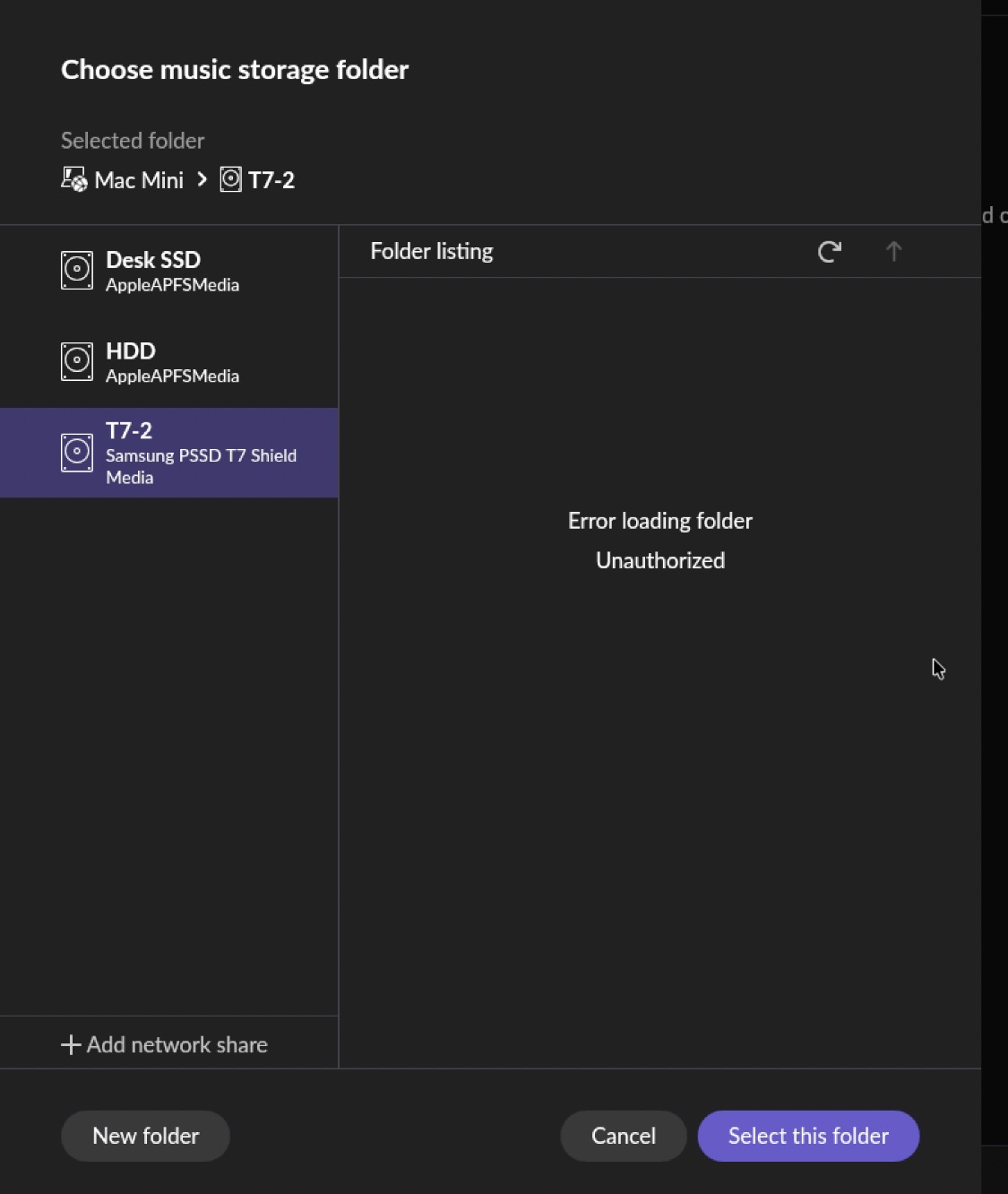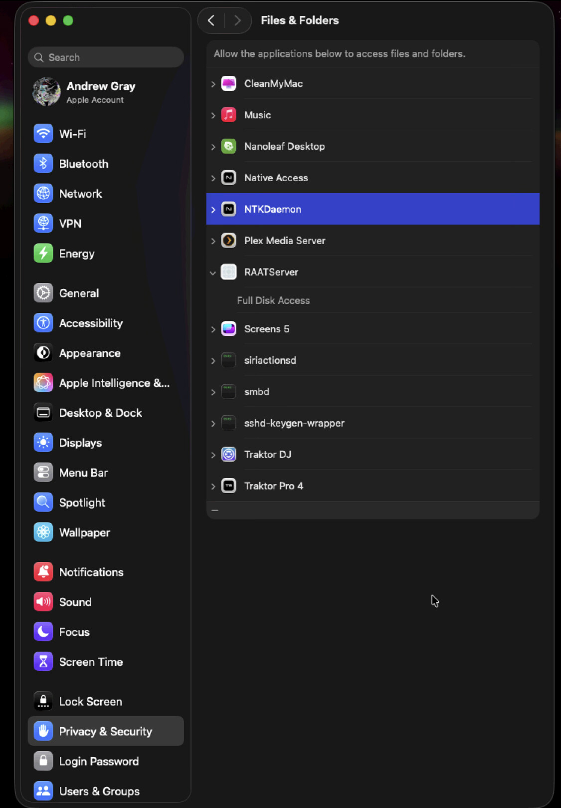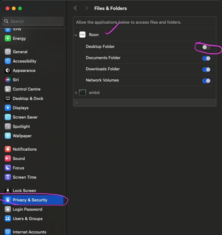 Would you kindly confirm that Roon has access to the “Files & Folders” in the Privacy & Security settings? In case it is already enabled, please toggle it off and back on again.