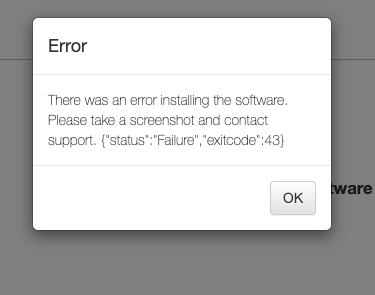 When trying to start up I'm getting the message There was an error installing the software. Please take a screenshot and contact support. {"status":"Failure","exitcode":43}