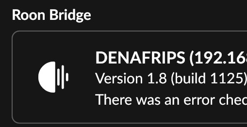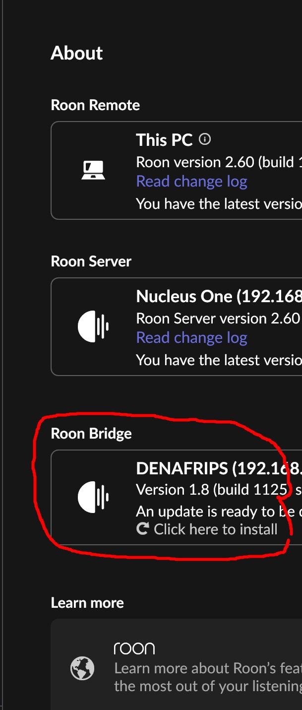 · Please see picture, In the "about" section the build versions of Roon remote, Roon server and Roon bridge are displayed. No problems with the first 2, but in the Roon bridge ( i have a Denafrips Arce Roon bridge), it always says there is an update available, but when I click install, I always get "error in checking for update". Is this a Roon issue or a Denafrips issue?