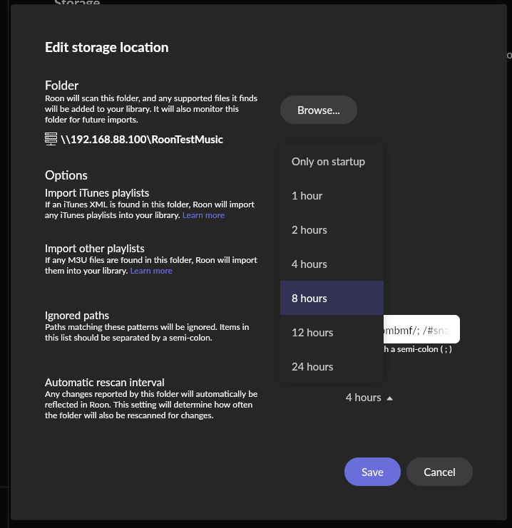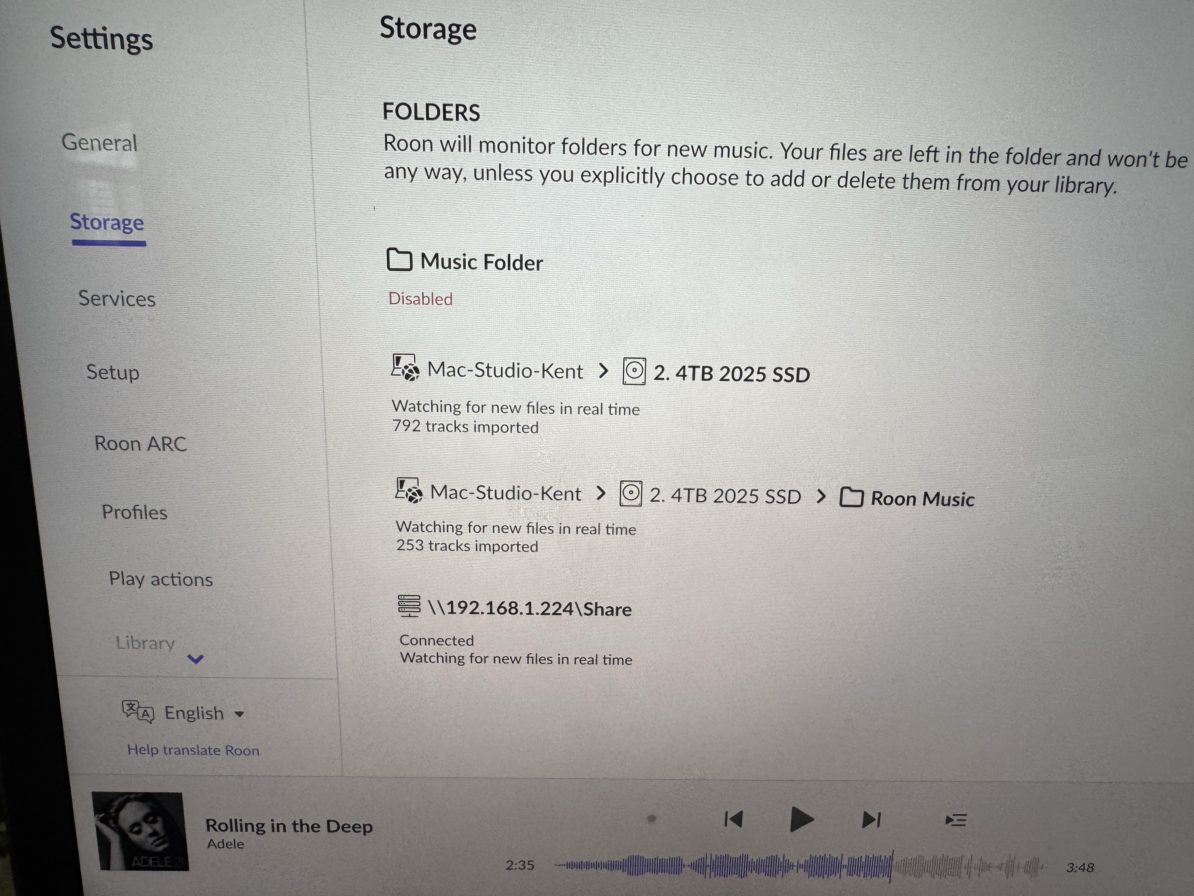Eversolo internal SSD does not appear in Roon Folders. The SMB folder appears in the storage menu. Reads connected and watching for new files. It should find 30 tracks already stored there.