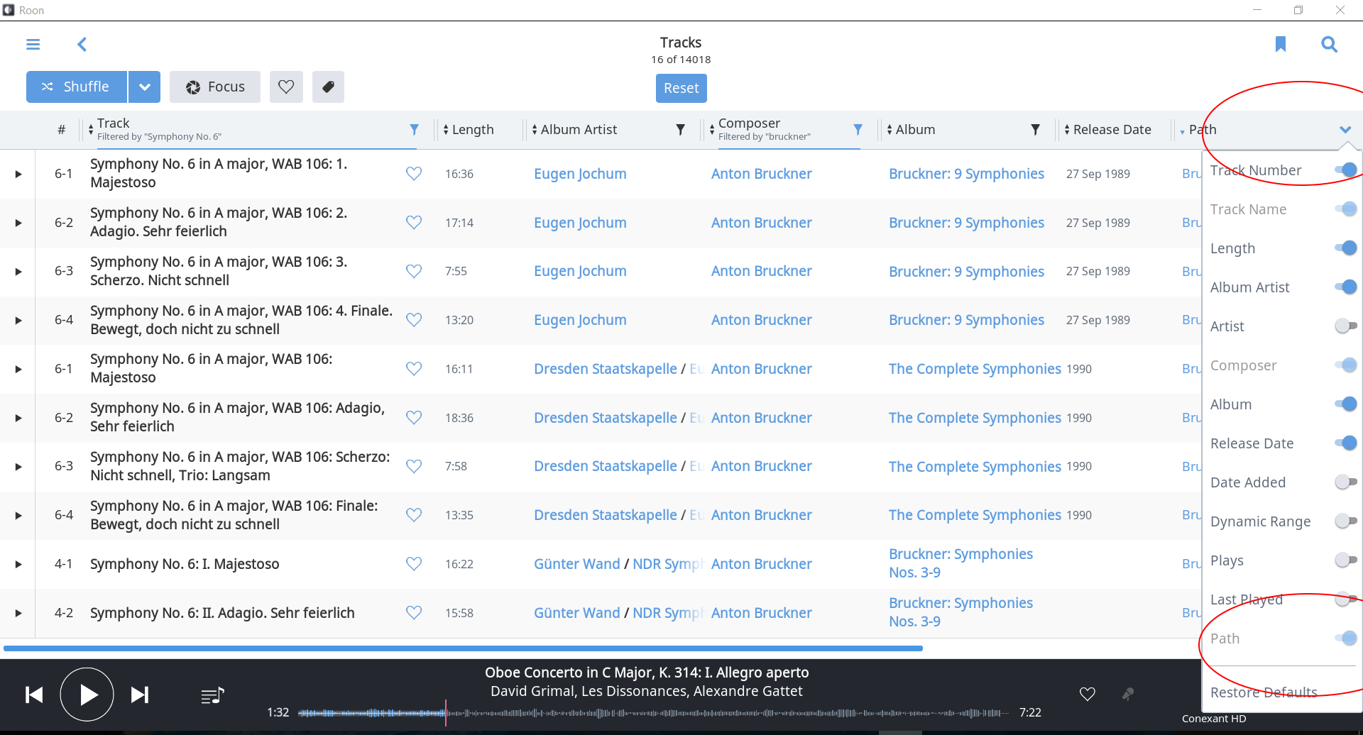 With Classical I use mostly the composition screen. I hardly ever use the tracks screen which is why I was not aware of this. But I imagine many Classical roonies have a lot of sunk effort and hidden information in their paths and it makes much more sense to me to tidy up my Classical library from the composition screen if that were possible. A path browser is not available from the composition screen. When I turn on the path column and I do a filter on Bruckner and Symphony No. 6 I see this: