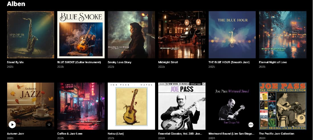 I’m referring here only to the discography of the artist Joe Pass on Spotify. I myself left Spotify a short time ago because more and more AI-generated music is appearing in the playlists.
