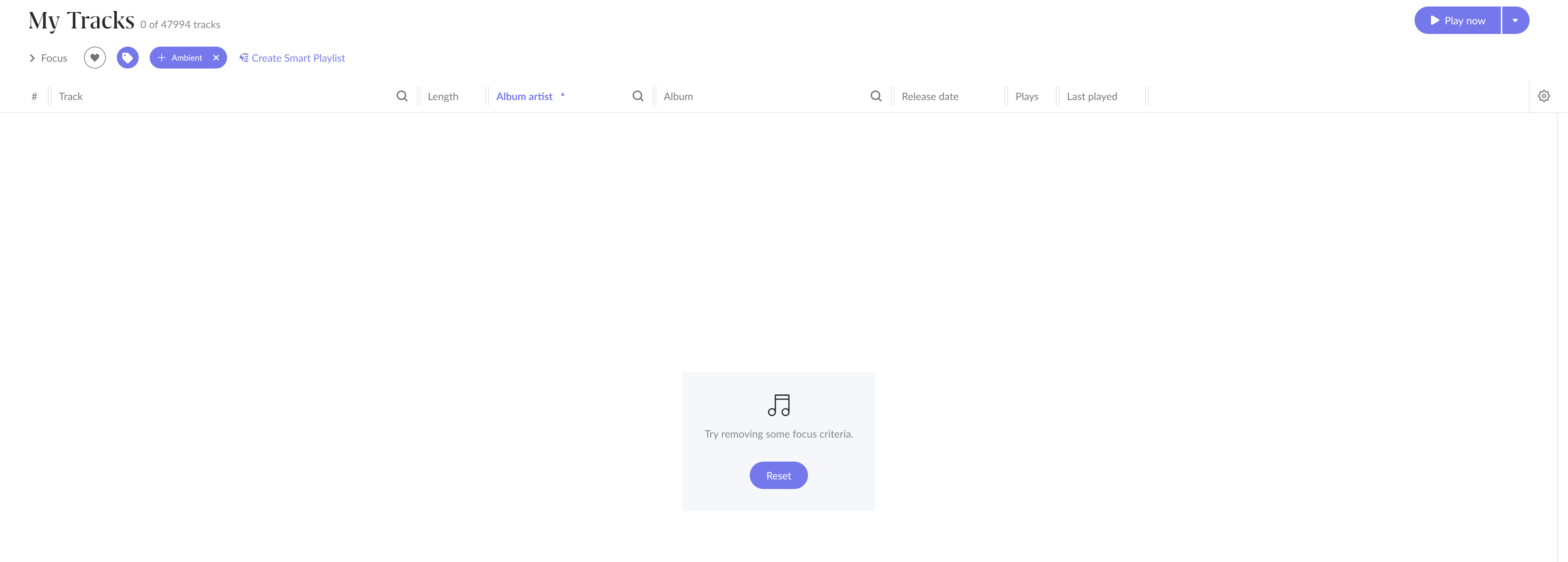 In my own case, I have a large library (50,000+ tracks) and a set of carefully curated genre-based playlists (Ambient, Disco, etc.) containing hundreds or thousands of tracks each. These playlists already represent a substantial investment of time and musical judgement. Naturally, I would like to use Focus to explore and refine these collections further — for example, to filter Ambient tracks by year, format, mood, or other criteria.
